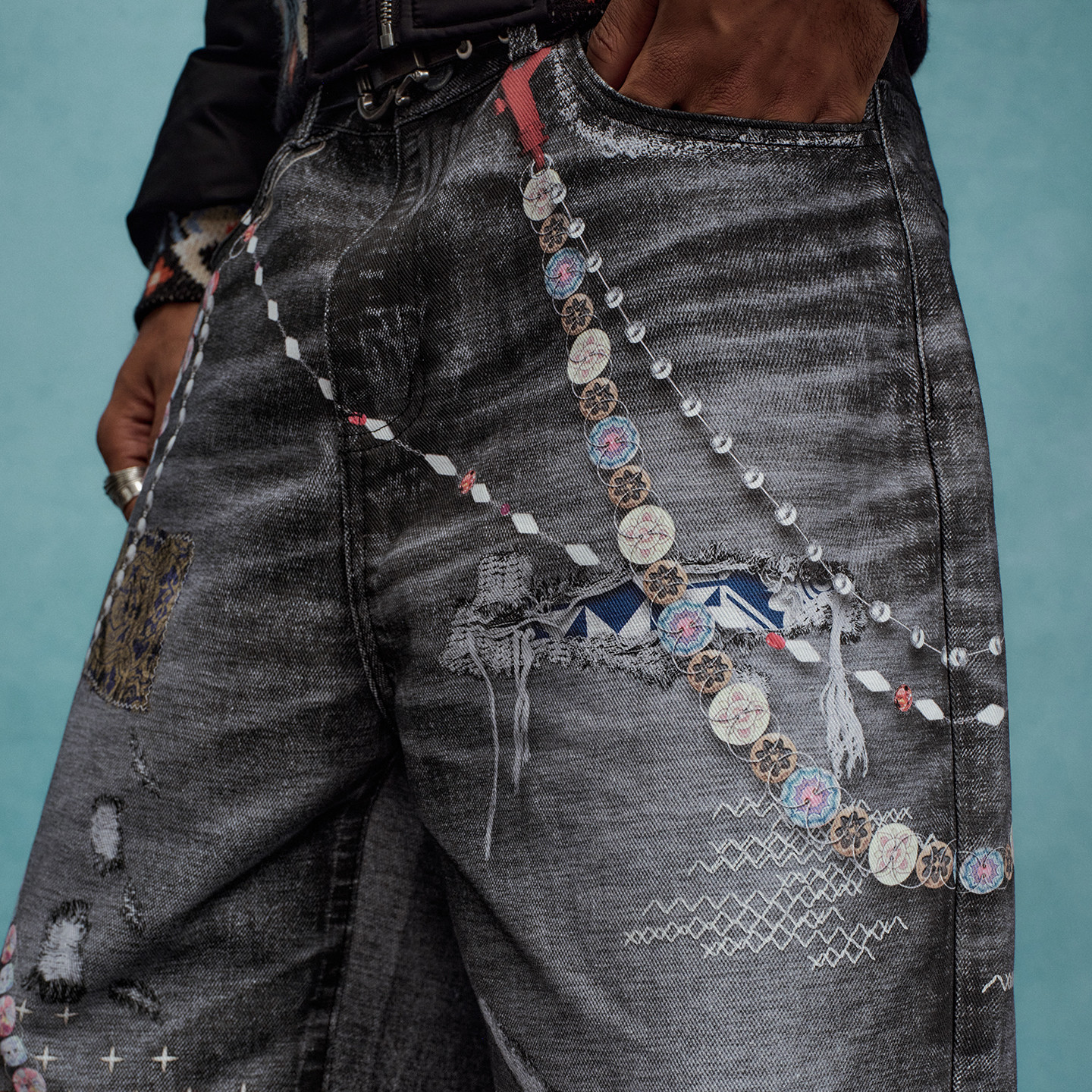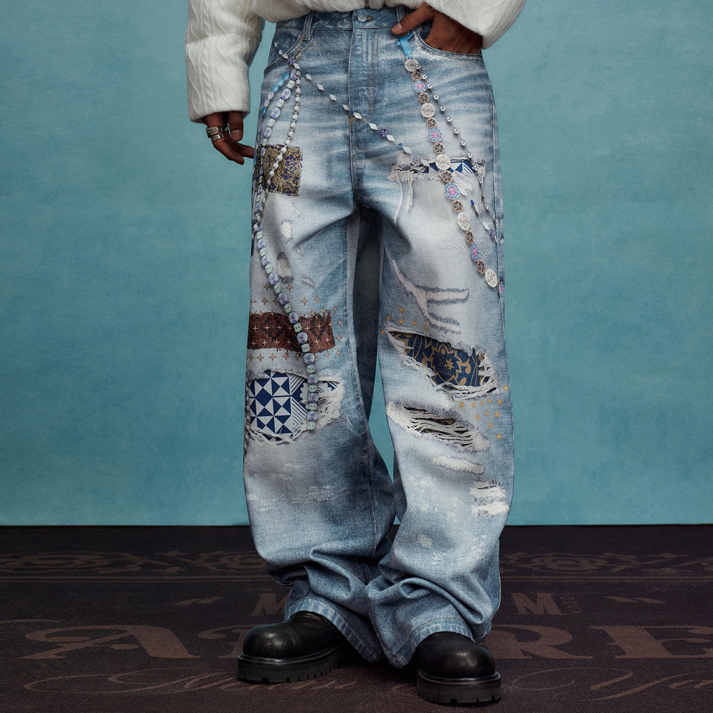 淘宝MEDMxYAD联名 百家布贴布破坏链条打印休闲牛仔裤秋冬直筒长裤男