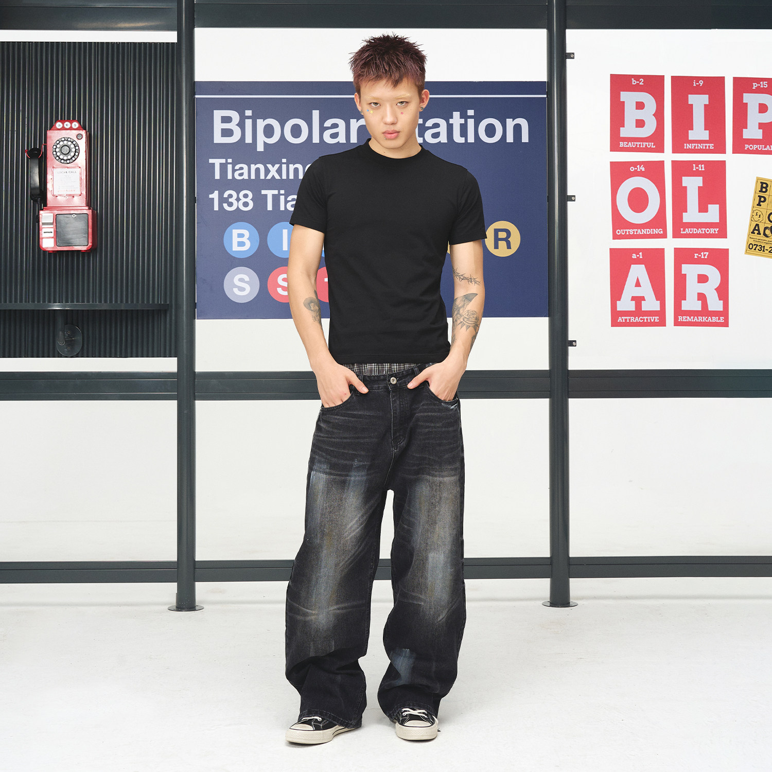 淘宝BIPOLAR猫须宽松直筒牛仔裤男女款美式高街复古做旧阔腿长裤潮牌