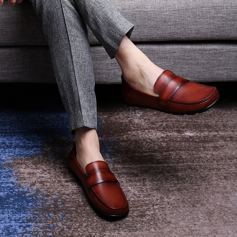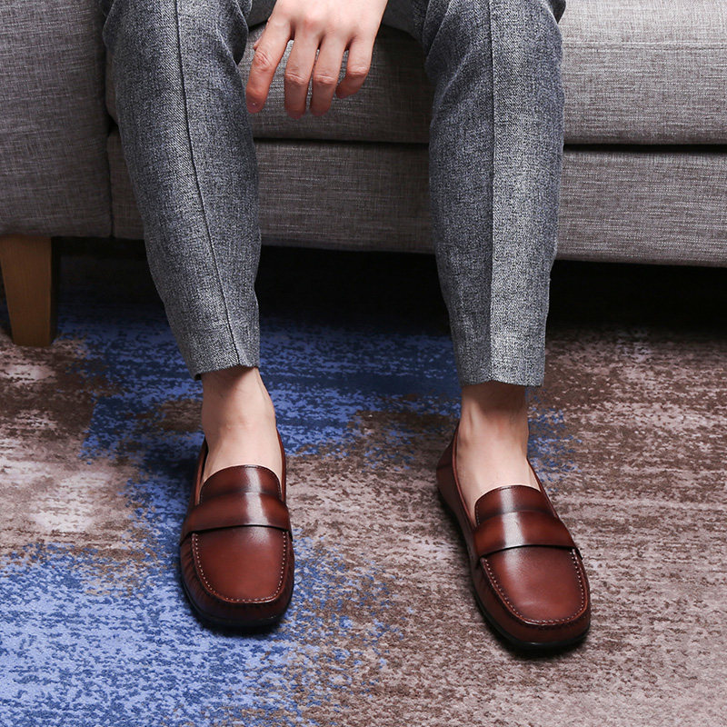 淘宝弓长梦男鞋豆豆鞋头层真皮擦色套脚便士乐福鞋休闲低帮皮鞋潮