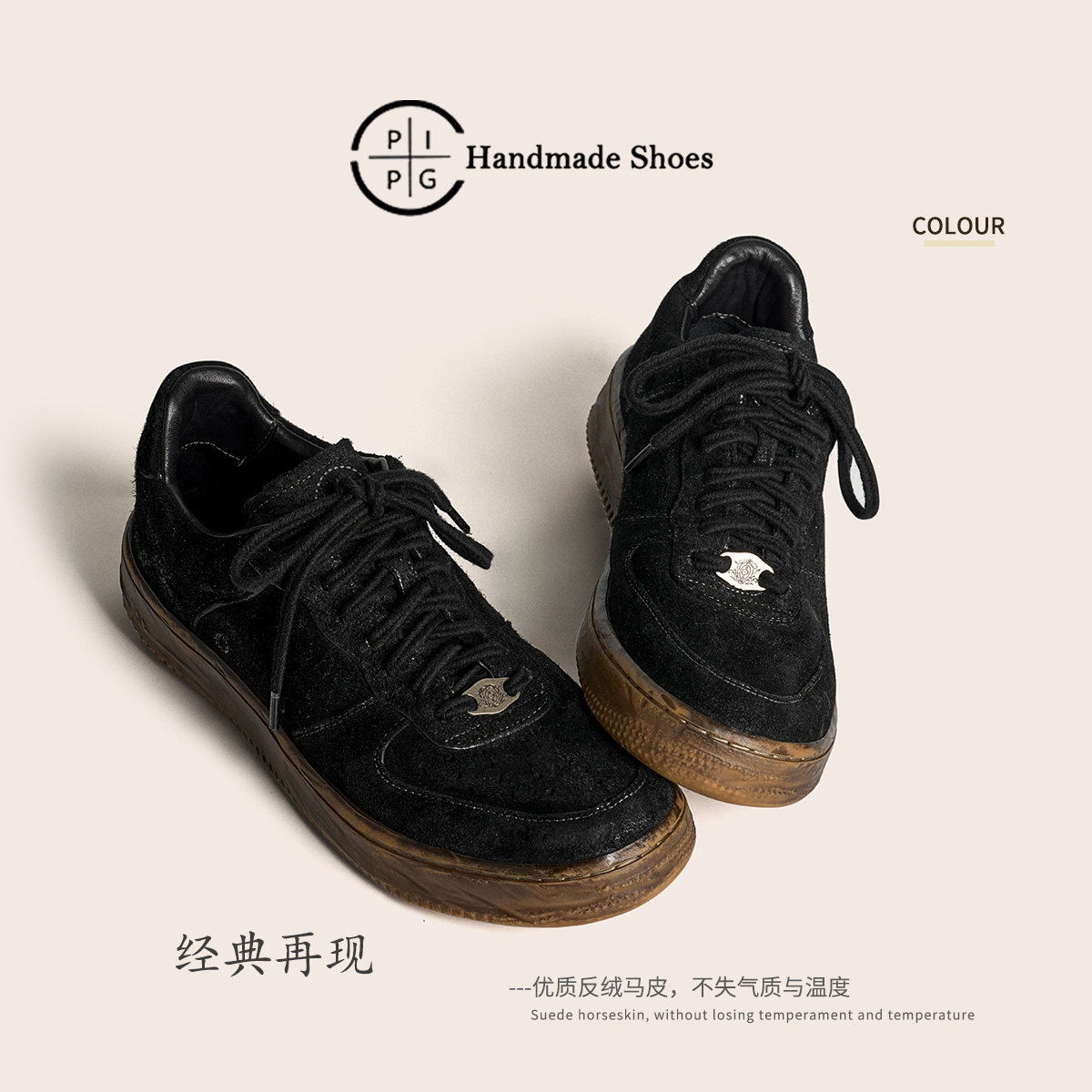 淘宝PIPG男鞋原创设计手工马反绒黑色真皮鞋复古运动休闲板鞋洗水马皮