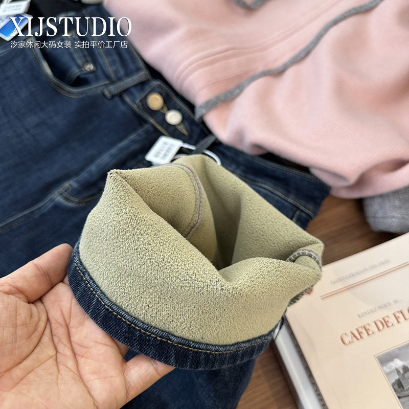 淘黑色牛仔裤女秋冬加绒大码胖mm梨形身材显瘦保暖窄版直筒裤长裤子