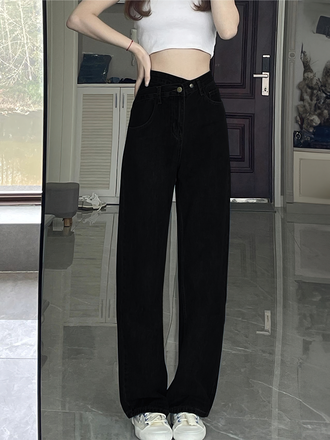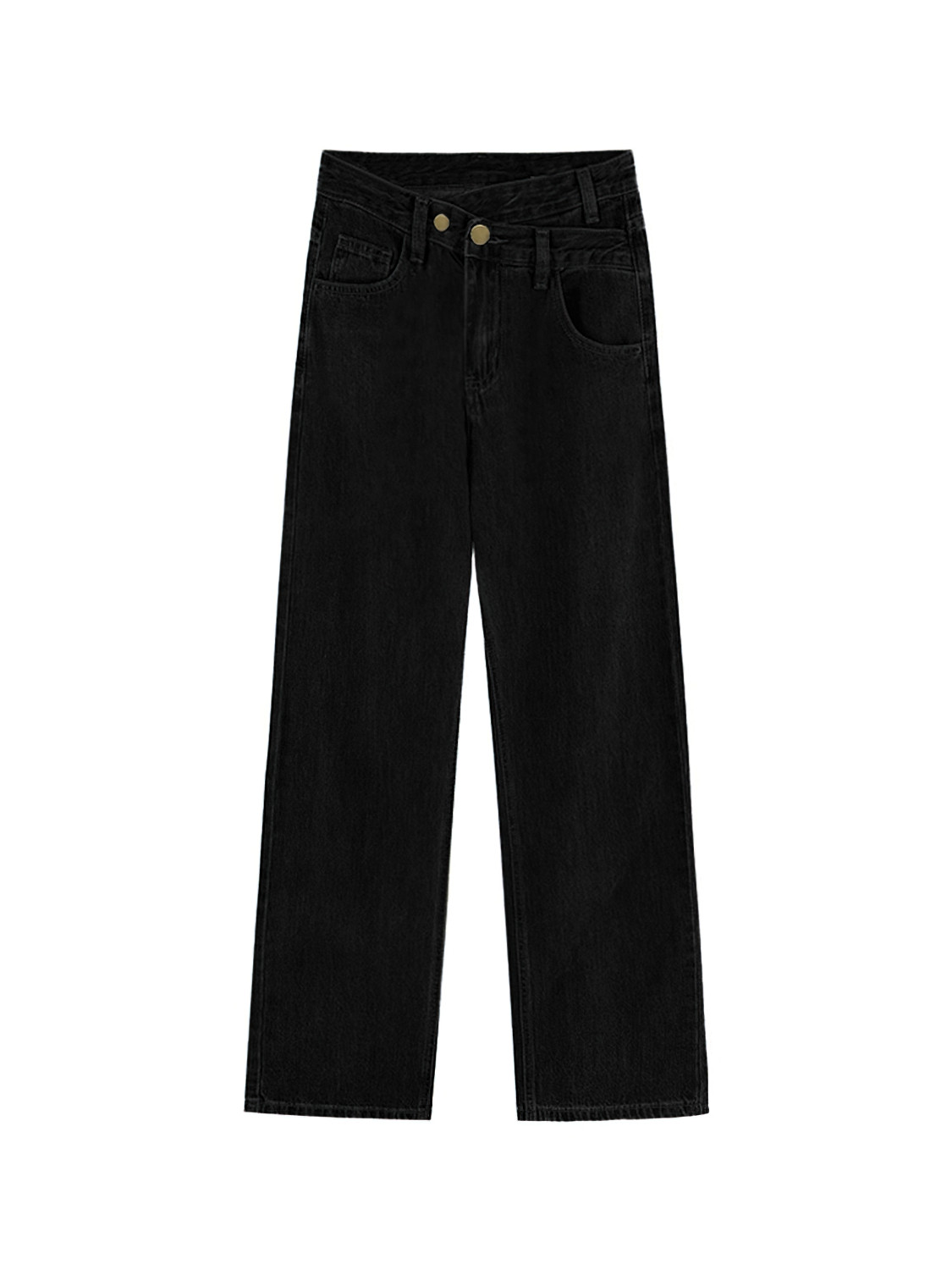 淘宝黑色不规则直筒牛仔裤女秋冬加绒胖mm高腰显瘦阔腿裤梨型身材裤子