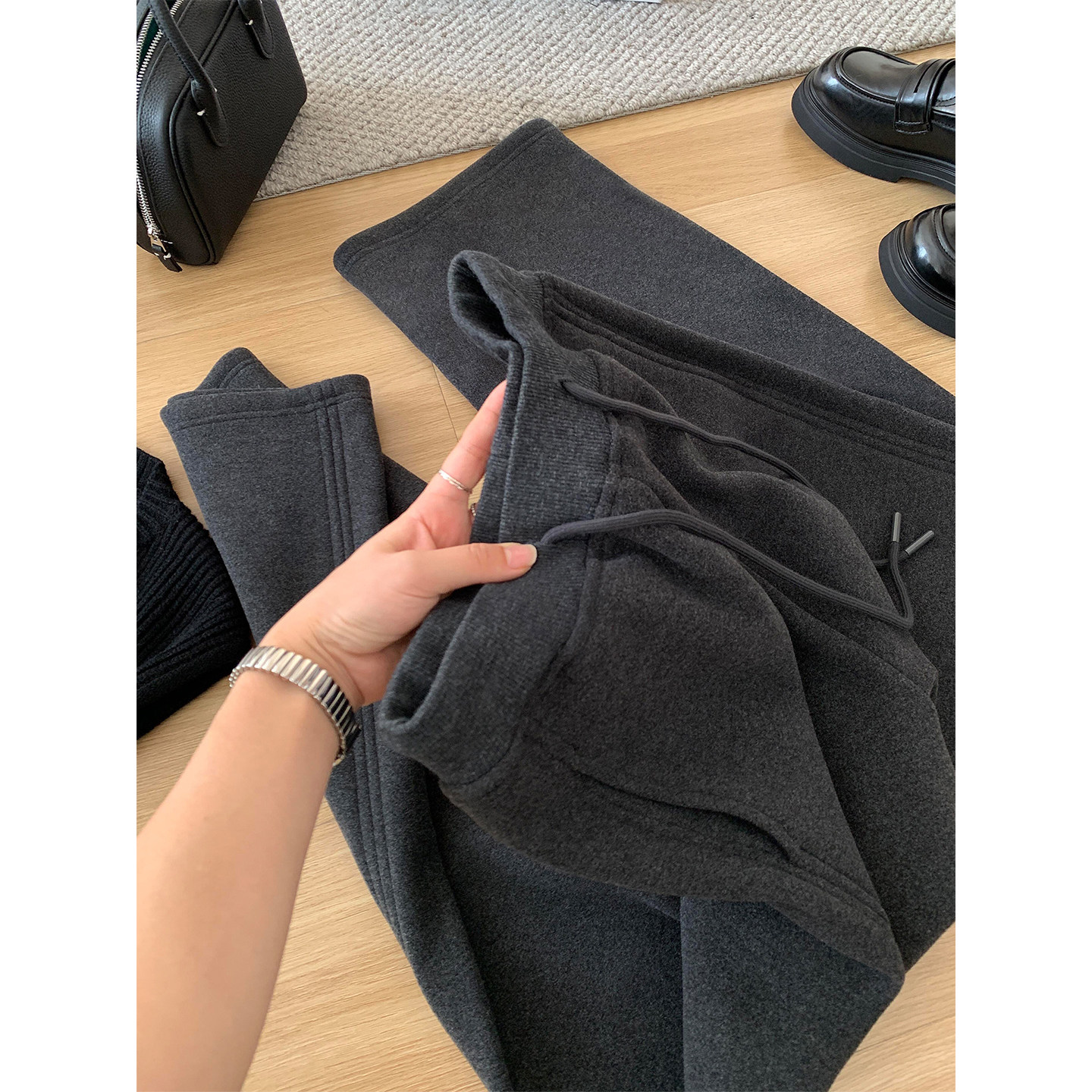 淘宝深灰色毛呢直筒休闲裤女冬季加绒加厚胖mm宽松显瘦小个子阔腿长裤