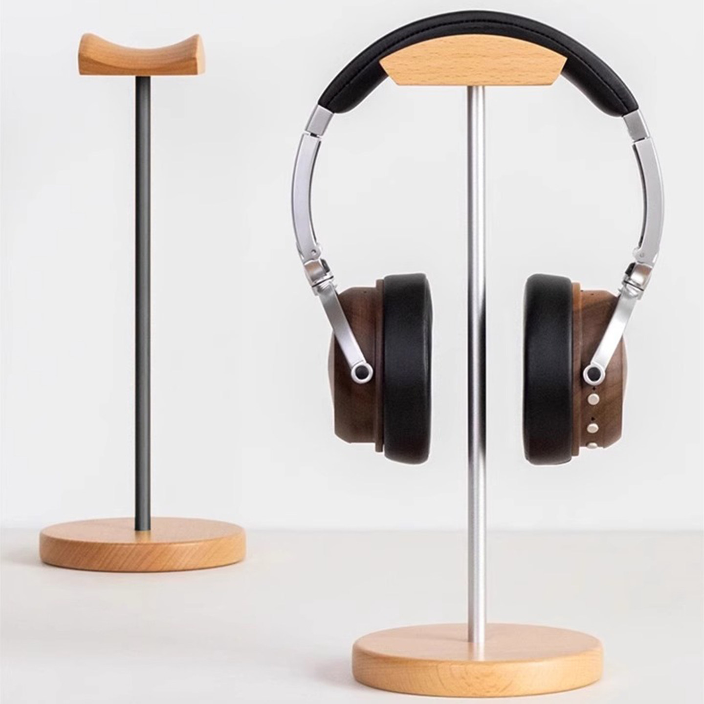 这款实木头戴式耳机支架采用优质胡桃木打造底座,纹理自然温润,质感高级,搭配坚固耐用的铝合金支撑杆,结构稳固且承重性强。整体设计简约现代,胡桃木色与金属质感相得益彰,既实用又具装饰性,完美融入居家、办公或工作室环境。支架顶部采用人体工学弧度设计,有效保护耳机头梁,避免变形;底部宽大平稳,防滑垫设计确保放置稳固。适用于绝大多数头戴式耳机,兼具收纳与展示功能,让耳机整齐摆放的同时成为桌面一道雅致风景。是音乐爱好者与设计师的贴心之选。