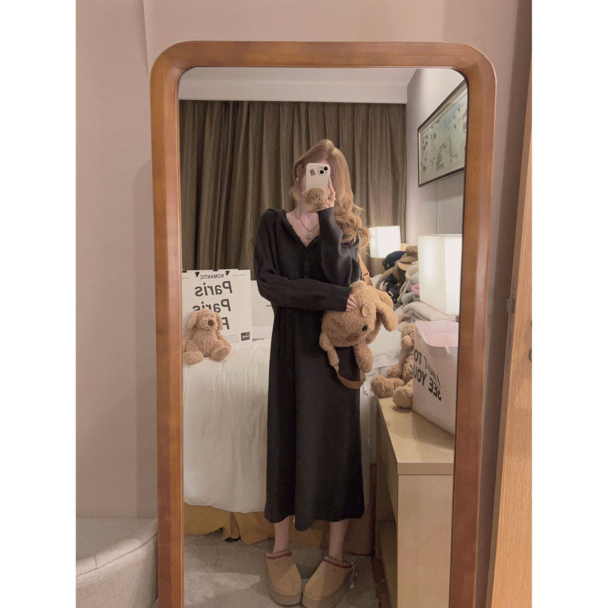 淘alex stevens 黑色v领长袖连衣裙女春秋海边修身显瘦a字长裙子垂