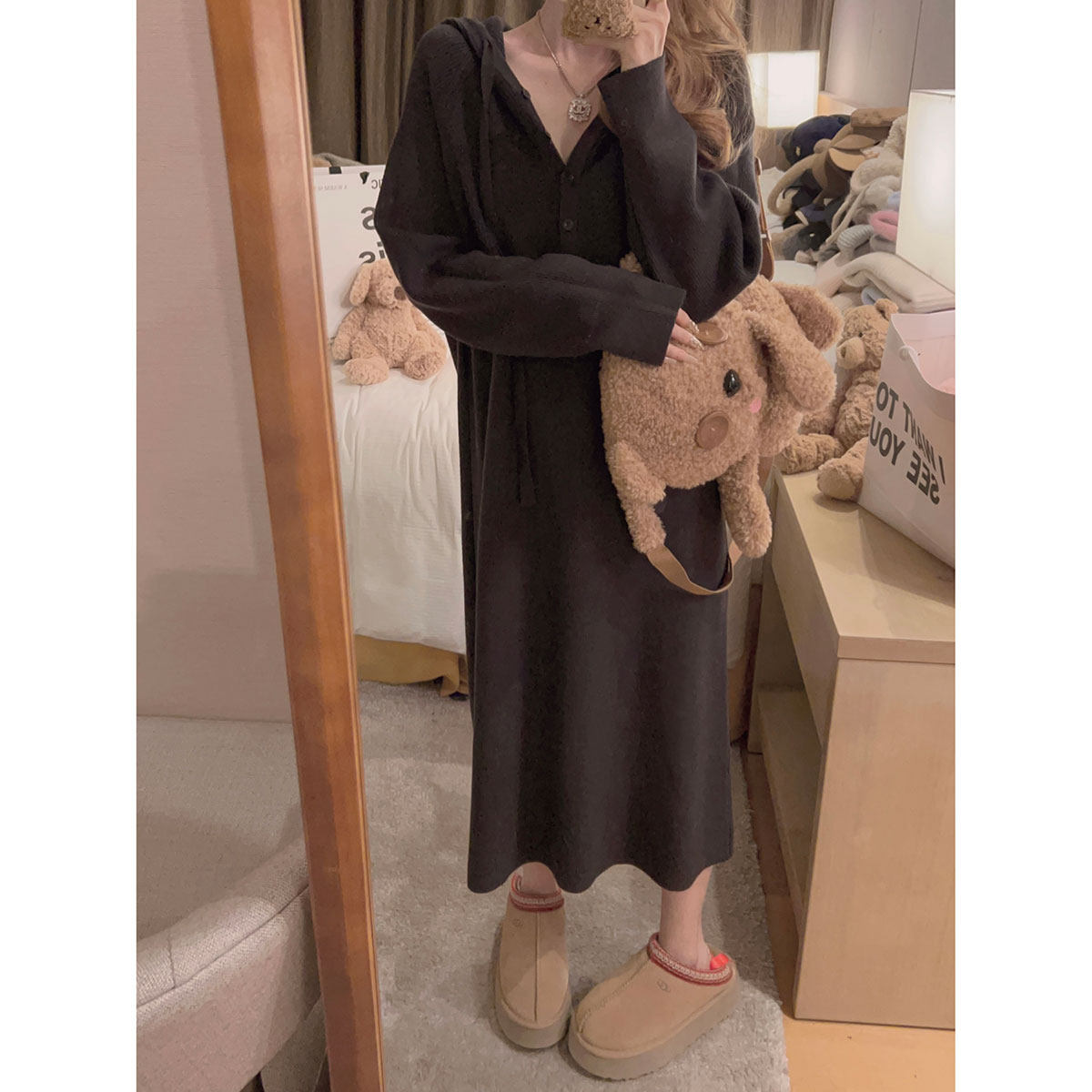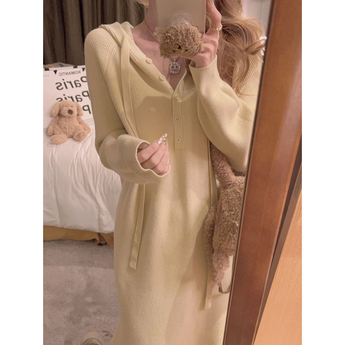 淘宝Yukiss 黄色小个子连帽针织连衣裙女冬韩系宽松显瘦内搭打底长裙