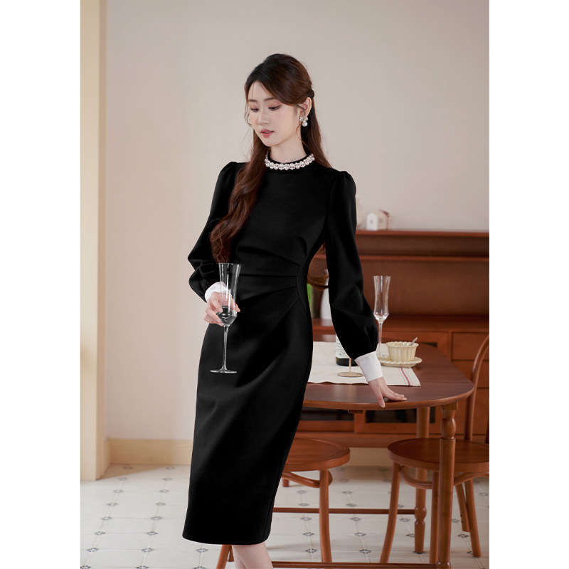 兰卡时尚2026春季新款黑色一字肩连衣裙长袖针织收腰百褶短裙女