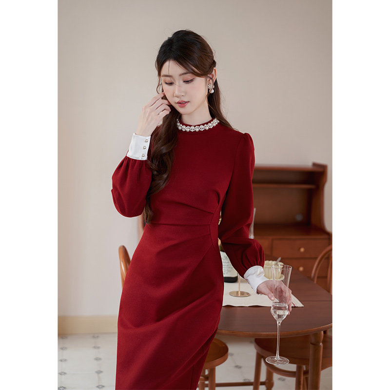 天猫韩语琳 法式气质长袖连衣裙2025新款收腰显瘦设计感红色修身裙女