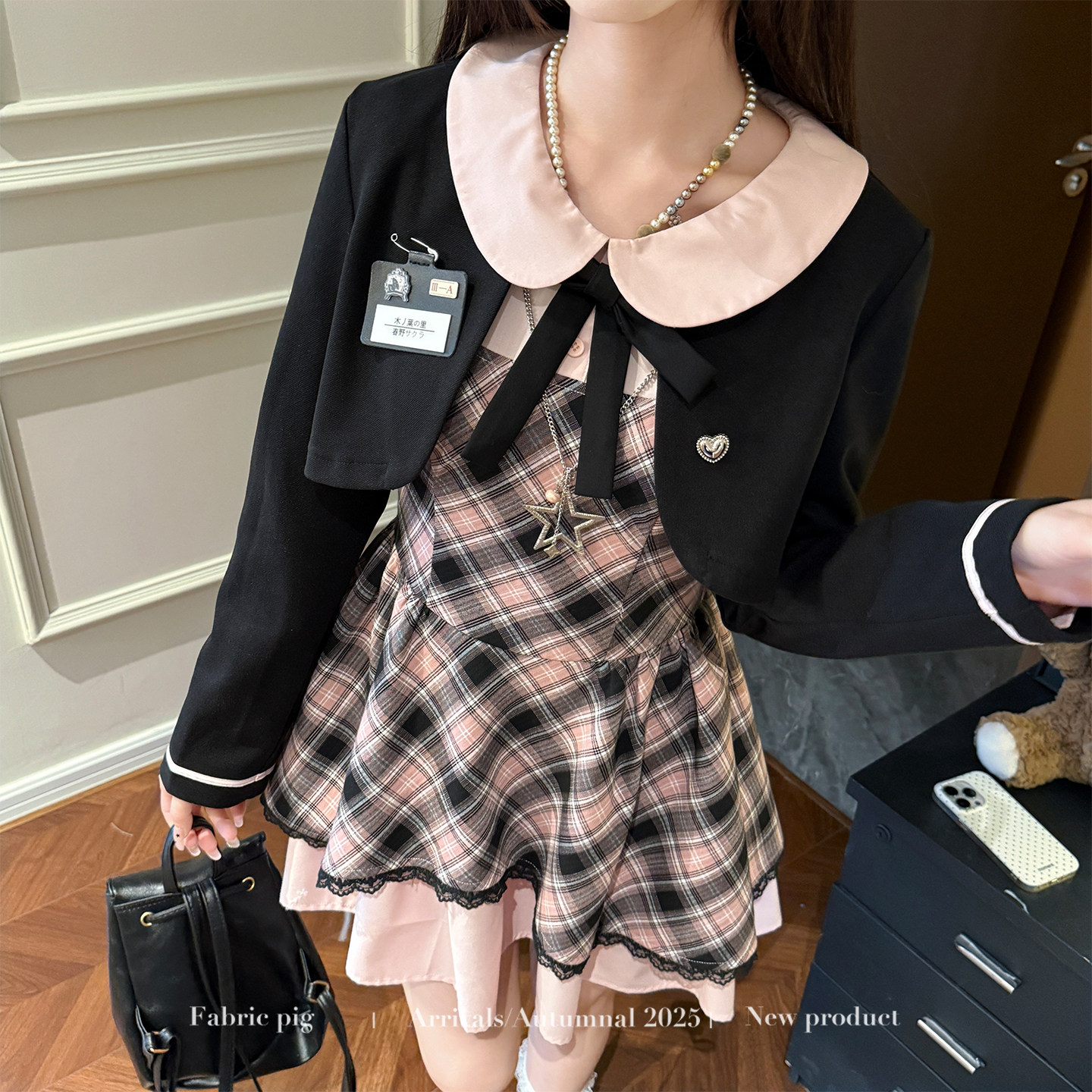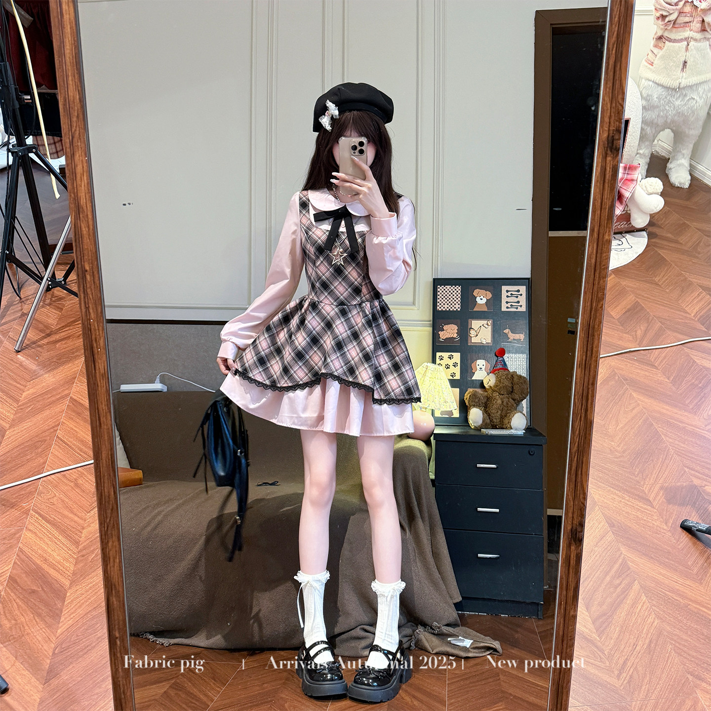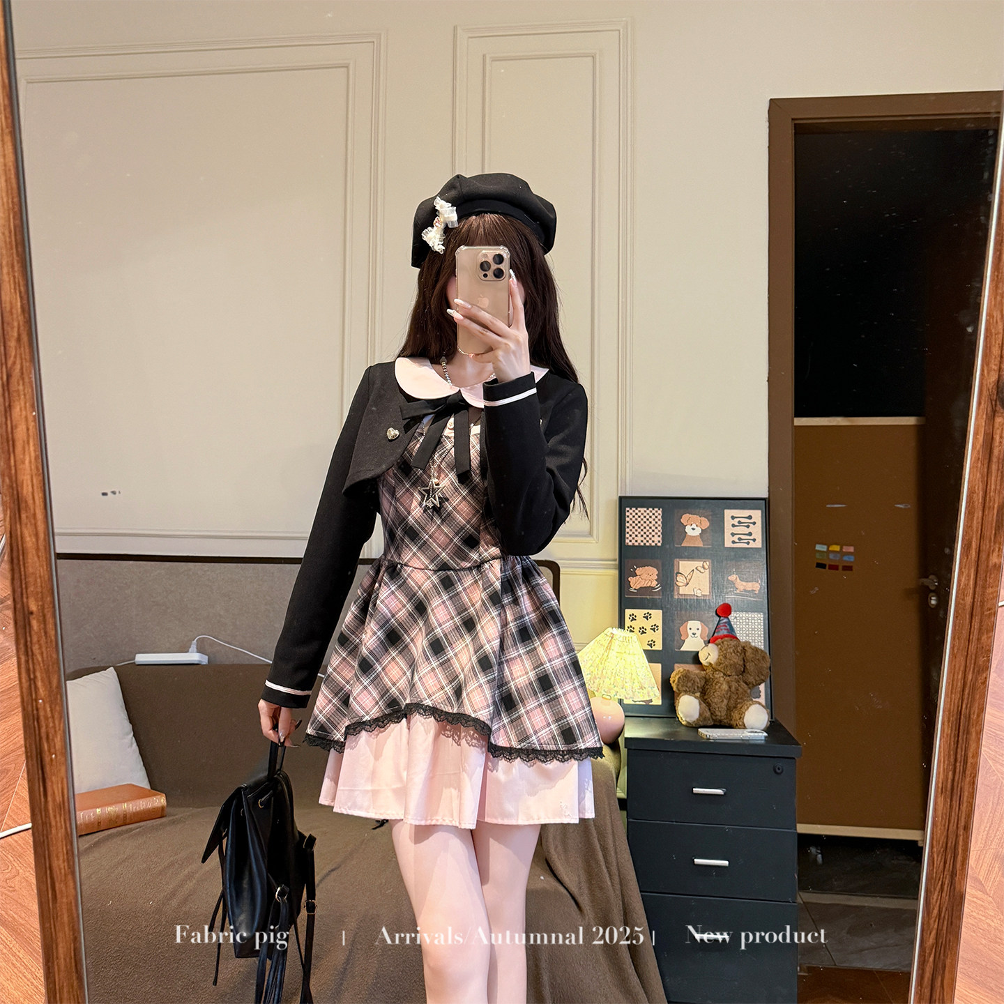 淘宝织物猪 黑甜粉阁 甜美风格纹娃娃领连衣裙女初秋小个子拼接短裙子