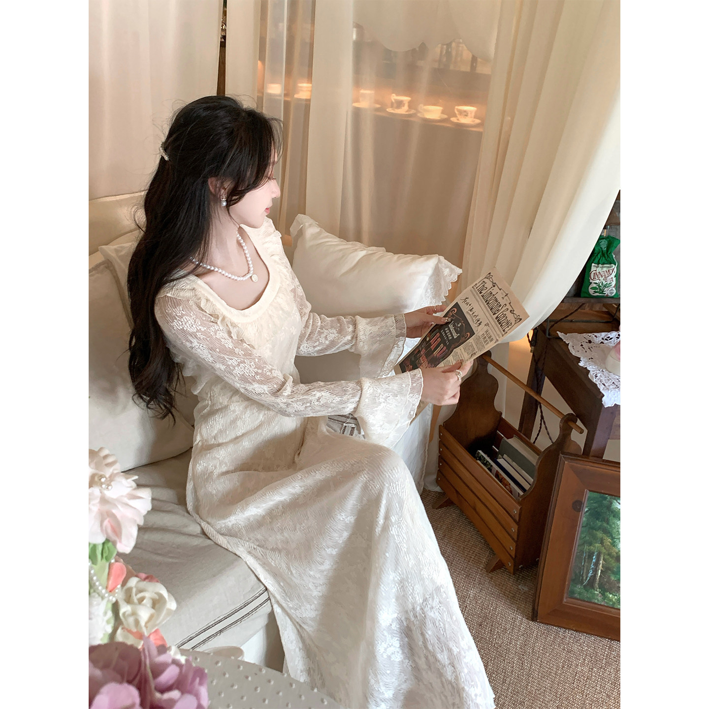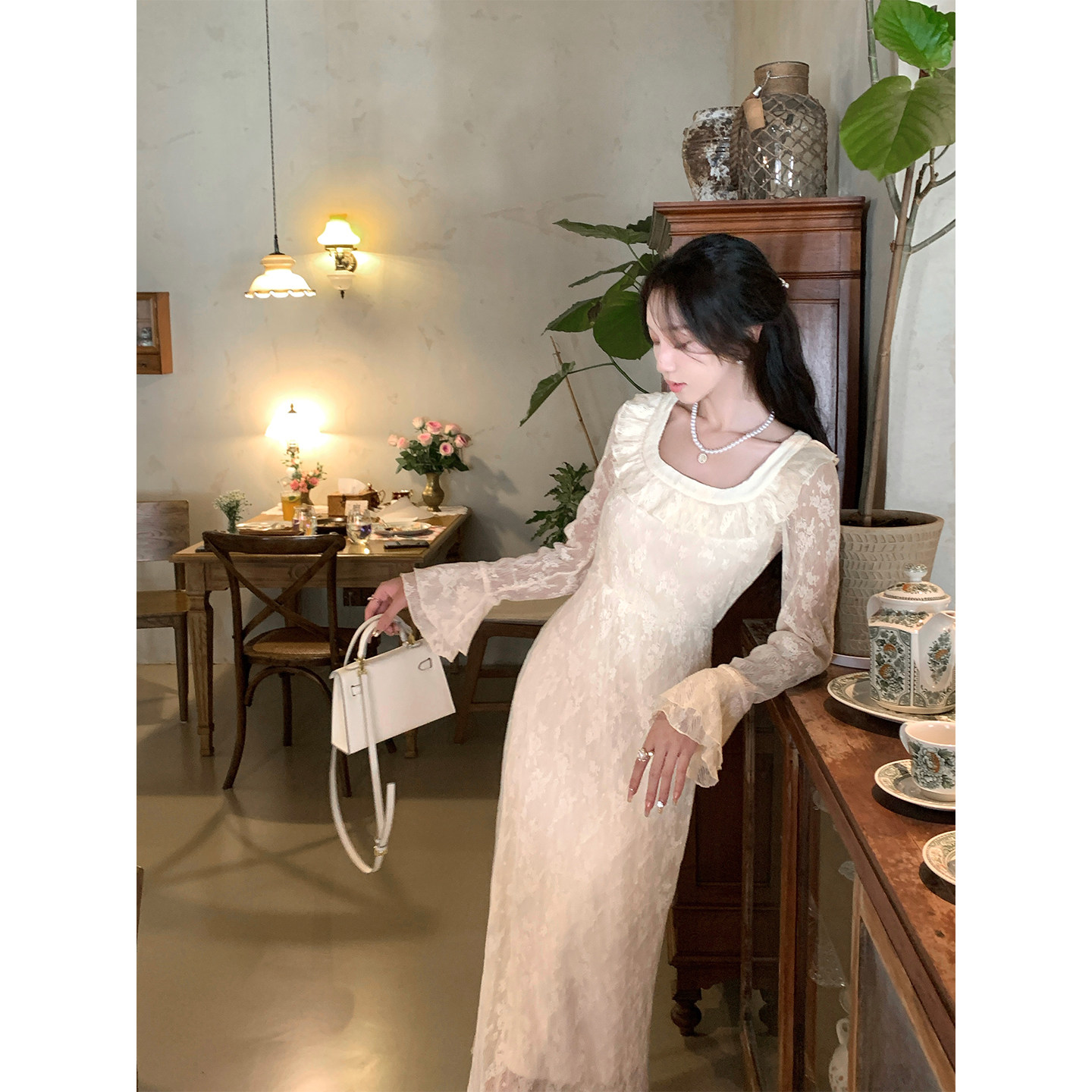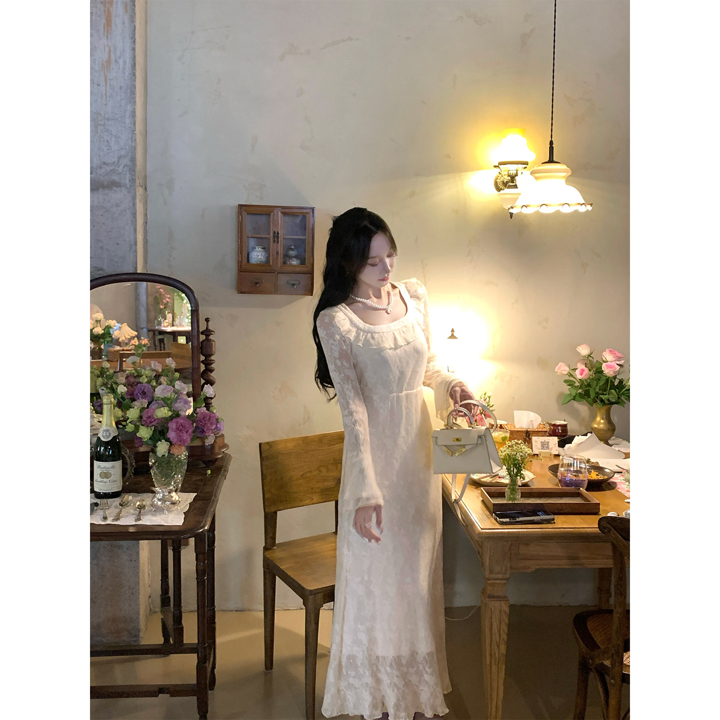 天猫韩语琳/法式千金精致蕾丝长袖连衣裙女2025新款气质名媛修身长裙