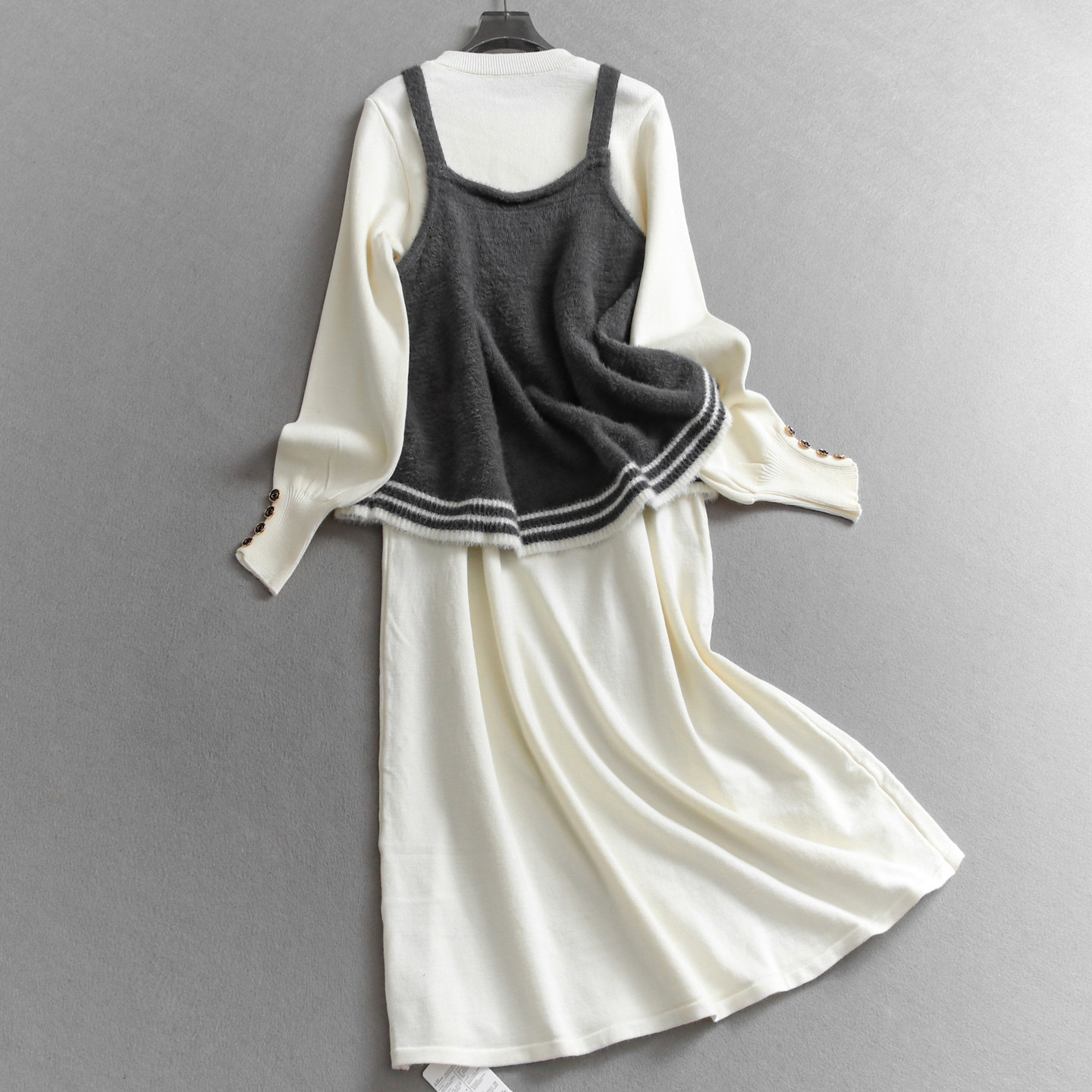 淘宝撞色裙套装圆领收腰长袖减龄针织毛衣裙叠搭两件套女裙连衣裙Q126