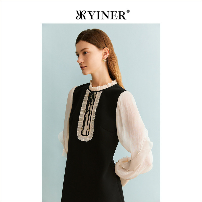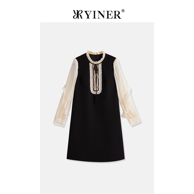 天猫YINER音儿专选秋季女装法式撞色木耳花边通勤风连衣裙