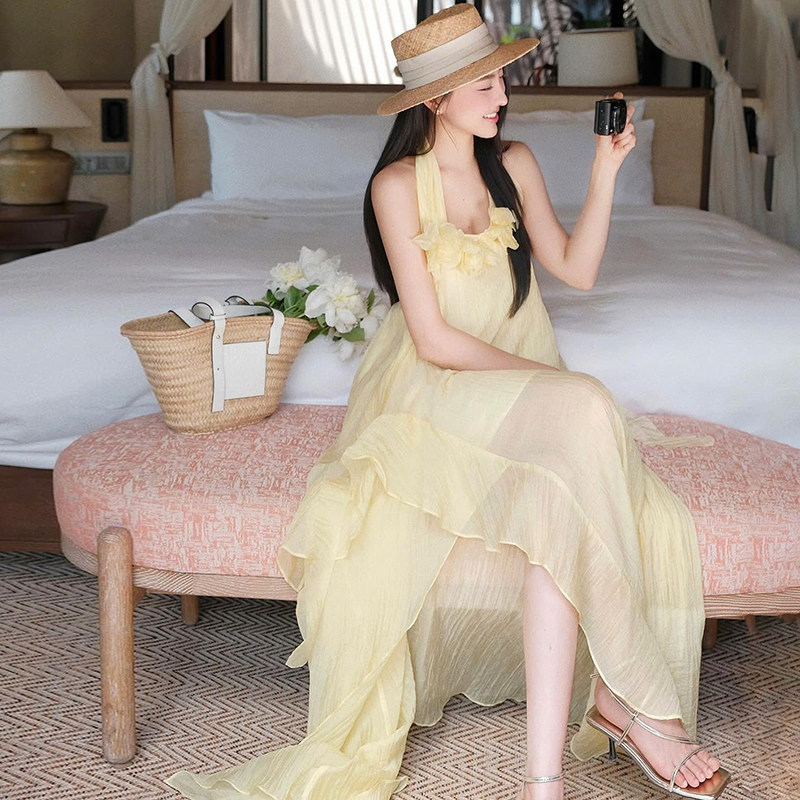 淘宝SylCue仙女度假风立体花饰显瘦飘逸挂脖连衣裙开叉百搭不规则长裙