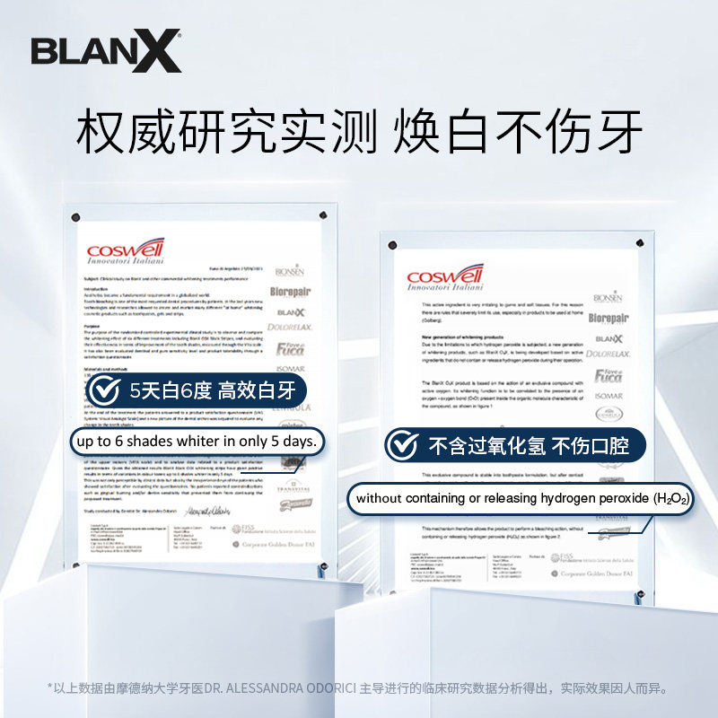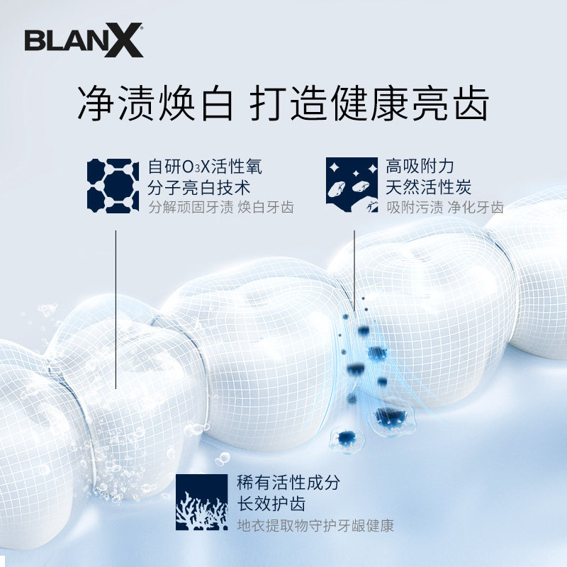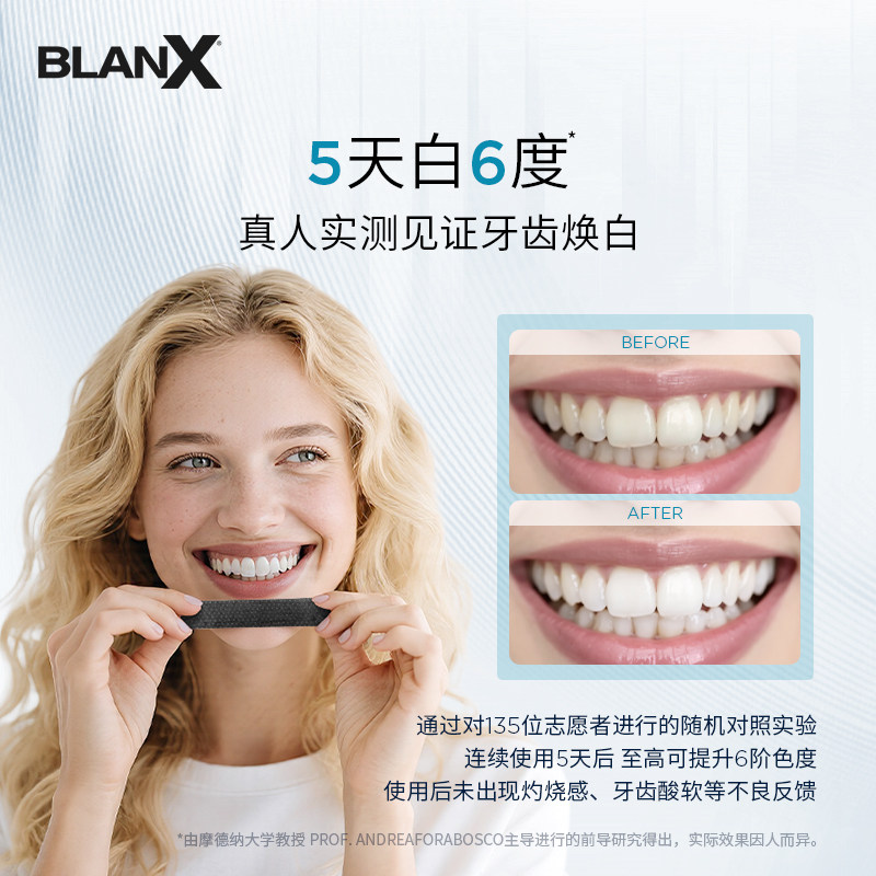 BlanXO₃X活性炭焕白牙贴,每盒10片装,专为追求亮白笑容人士设计。采用高纯度活性炭成分,有效吸附并深层清除牙齿表面及缝隙中的色素沉积,如烟渍、茶垢、咖啡渍等,温和不伤牙釉质。贴合式设计紧密附着牙齿,使用方便,仅需每日使用30分钟,连续7天即可显著提升牙齿亮白度。产品通过安全测试,适合敏感牙齿人群,使用后口腔清新舒适。无需专业操作,居家即可享受专业级美白体验。BlanXO₃X活性炭焕白牙贴,让自信笑容从“齿”开始,是日常口腔护理的理想之选。坚持使用,助您绽放迷人光彩。