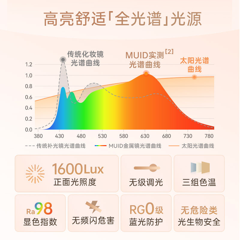 MUID金属镜台式LED智能补光桌面梳妆镜,采用高清银镜面板,呈现真实无畸变成像,搭配全光谱LED光源,模拟自然日光,显色指数高达Ra95+,让妆容色彩更真实。镜身由优质金属打造,稳固耐用,简约圆镜设计时尚百搭。支持三档色温调节(冷光、自然光、暖光)与无极调光,满足不同场景与肤质需求。触控灵敏,操作便捷,内置USB充电接口,续航持久。无论是日常护肤、精致上妆,还是夜间护肤,都能提供均匀柔和的光线,打造专业级美妆体验,是追求品质生活的理想梳妆伴侣。