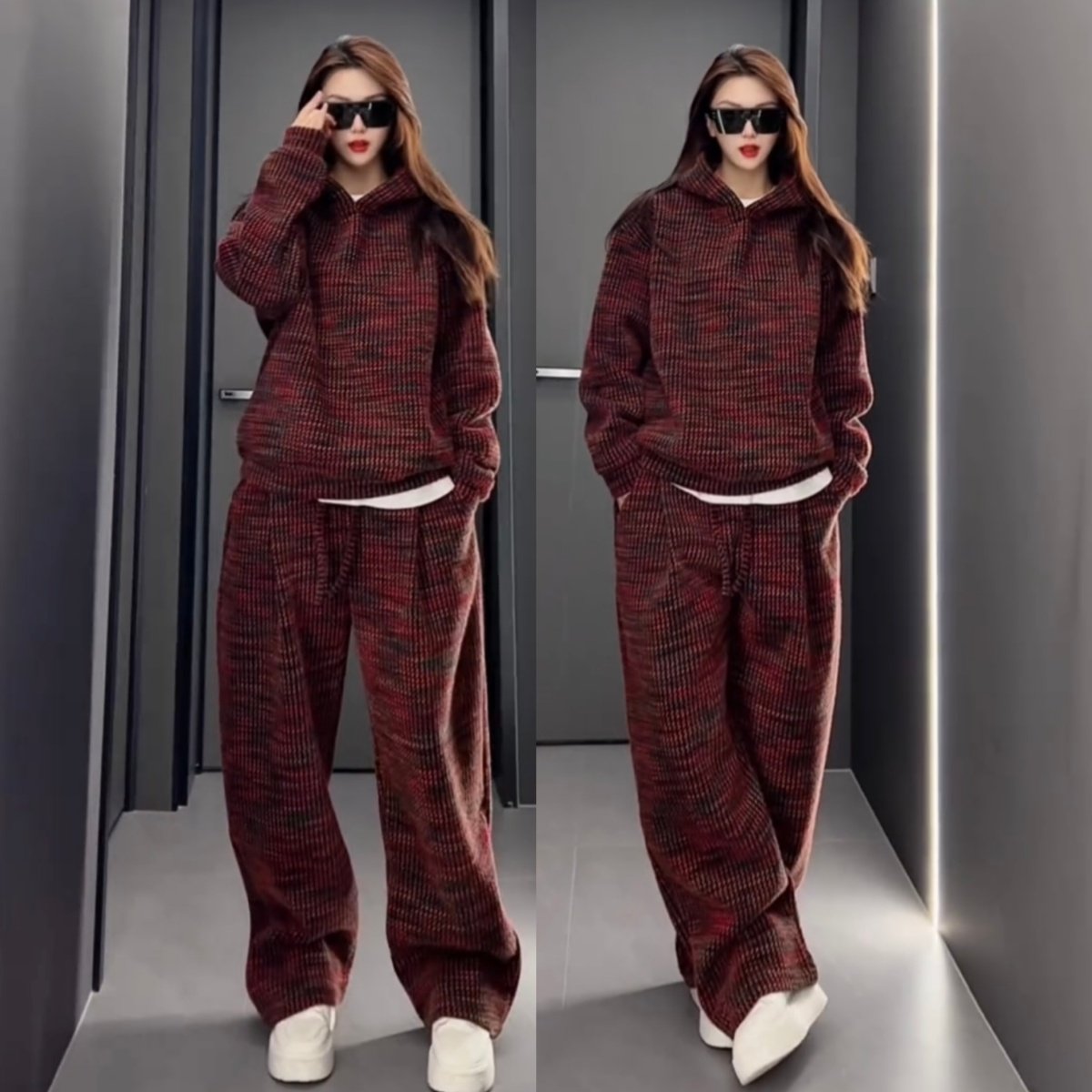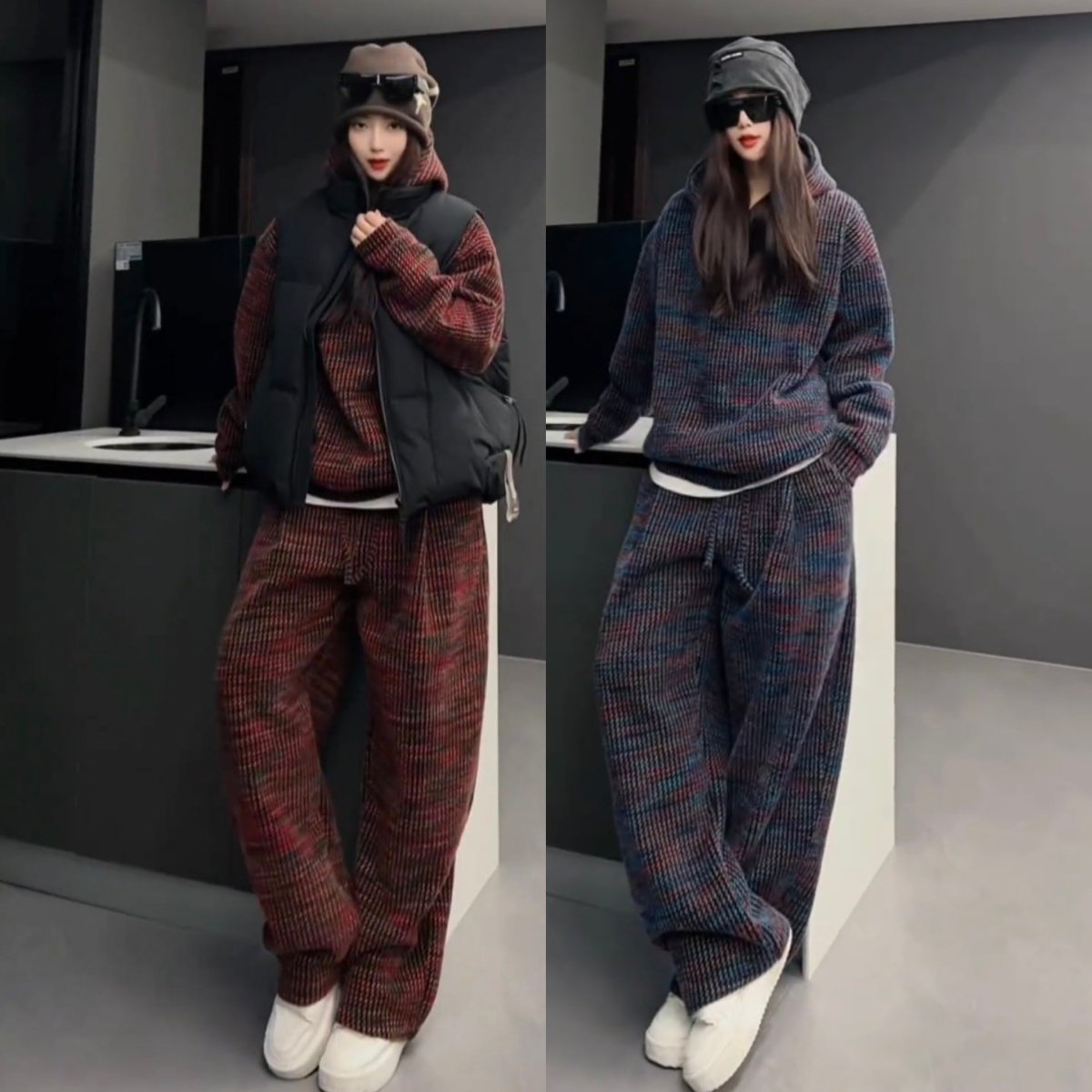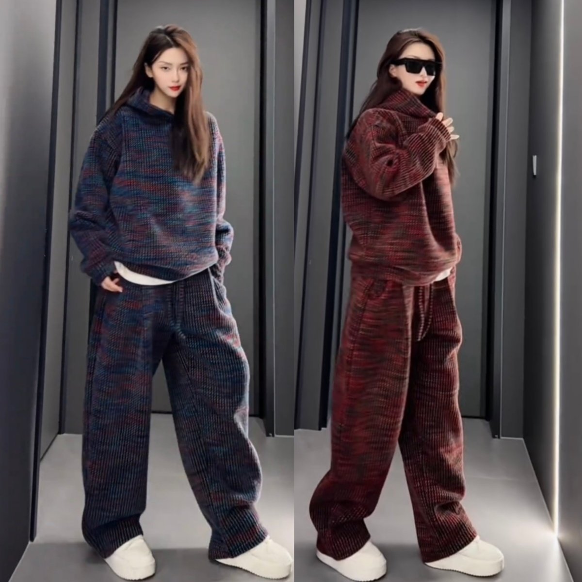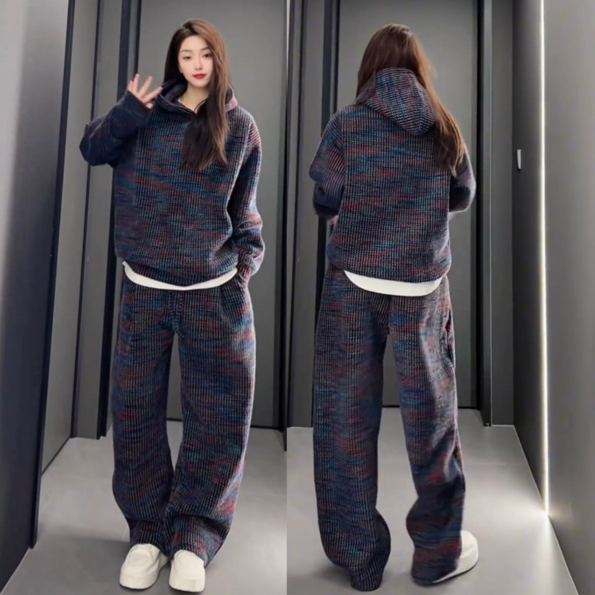 淘宝冬季重磅加绒加厚色织提花休闲运动套装情侣款连帽卫衣长裤两件套