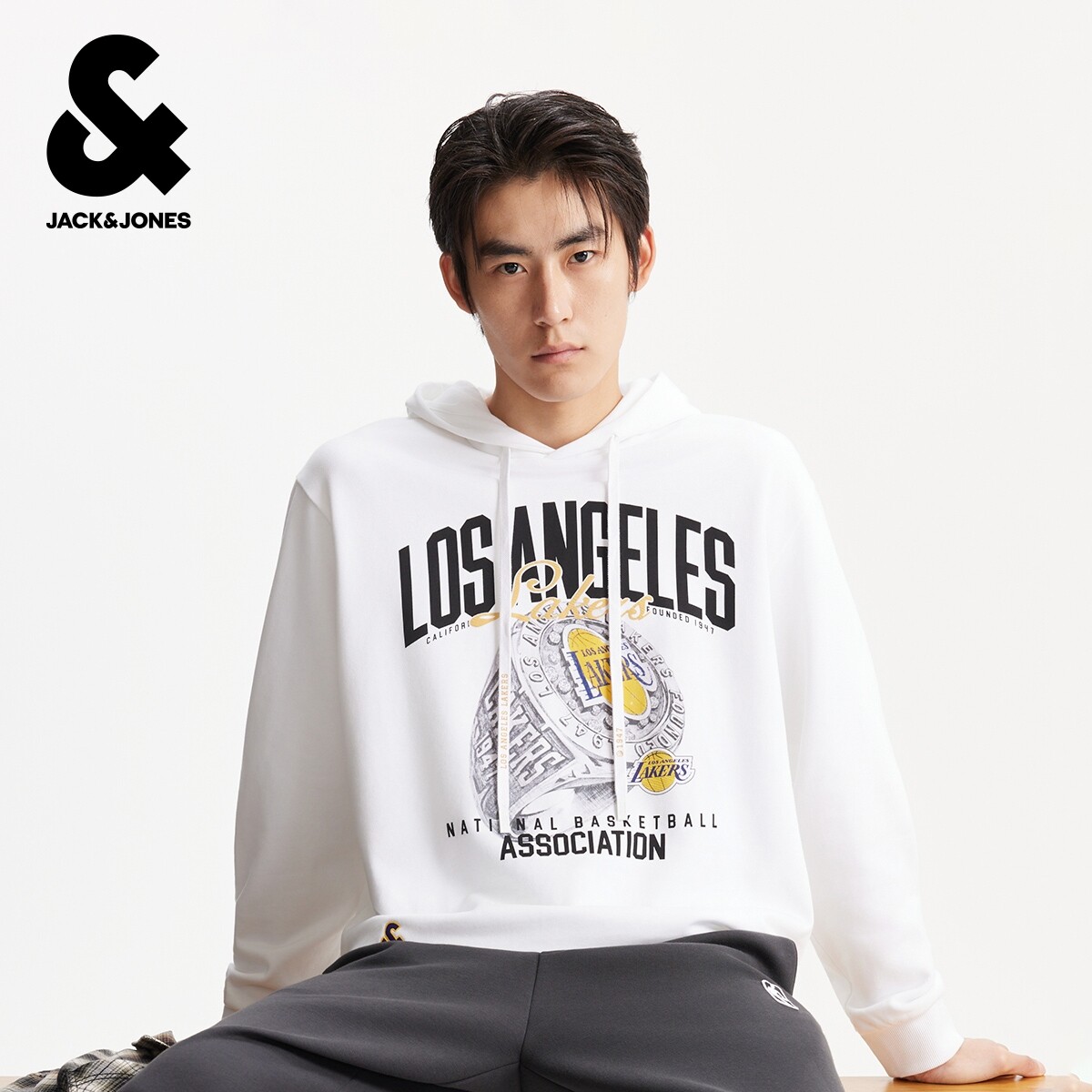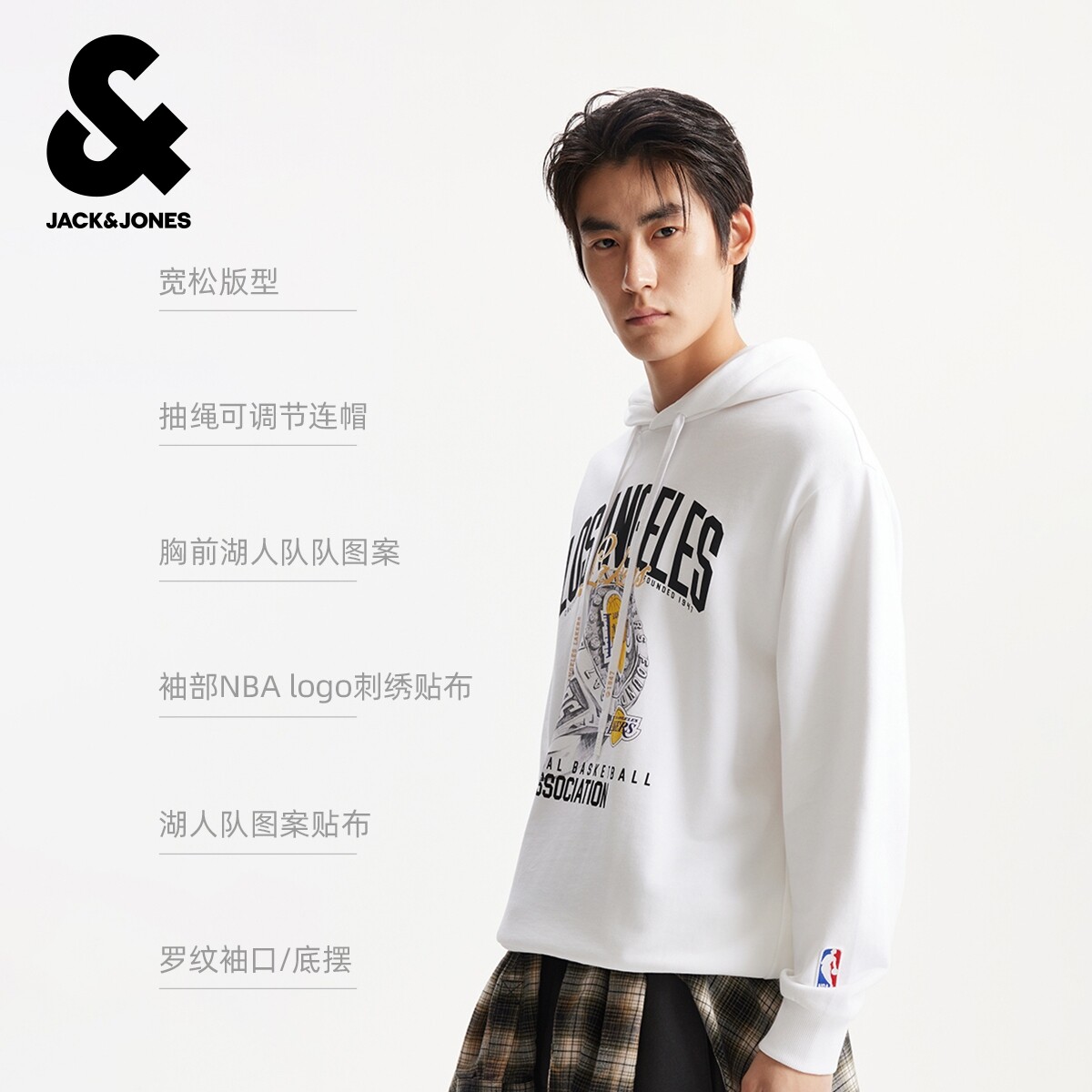 天猫杰克琼斯男装秋冬卫衣上衣略宽松抽绳可调节湖人球队字母图案设计