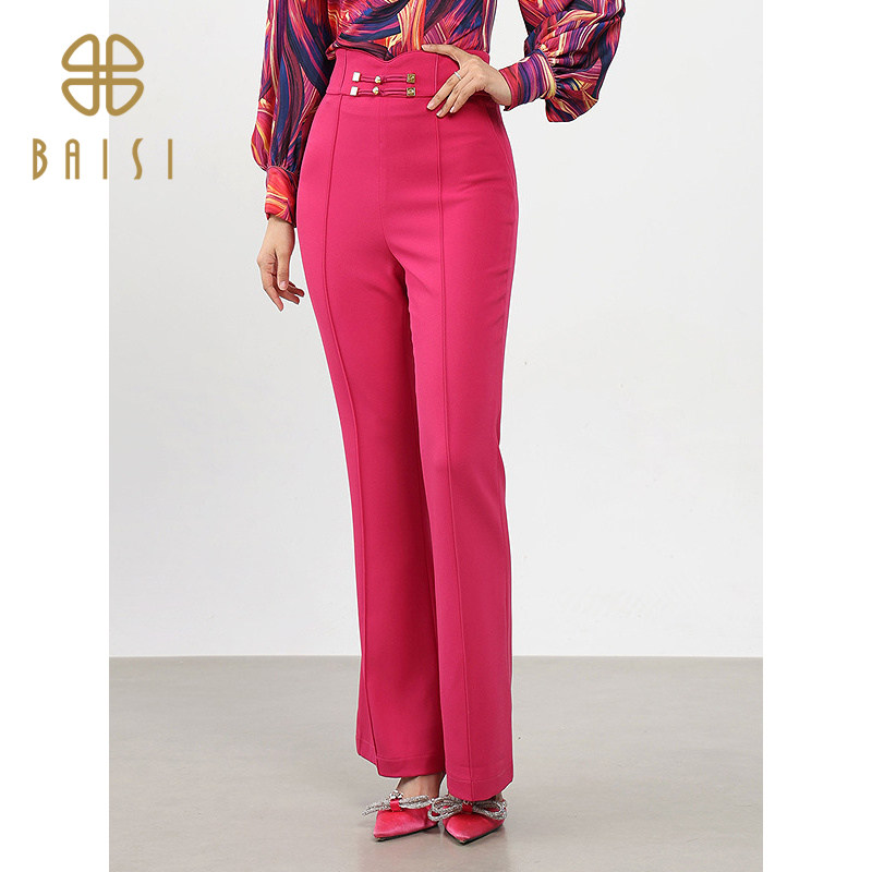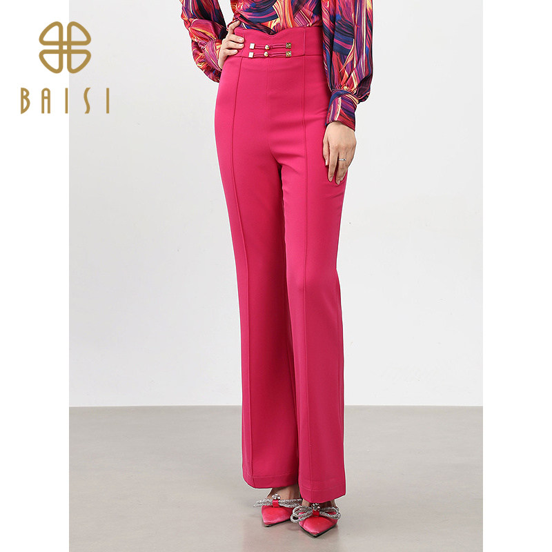 天猫百丝时髦洋气玫红色修身西裤2025春季新品复古纽扣微喇叭长裤女