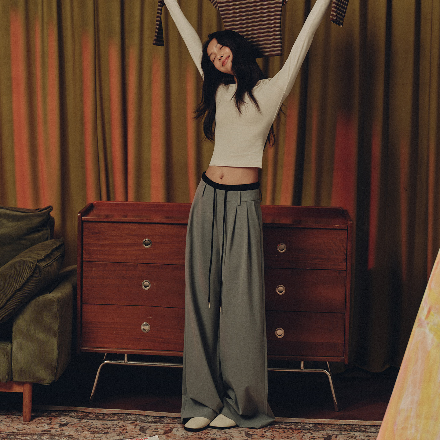 淘宝asomesome复古假两件双腰头撞色西裤女秋冬垂感阔腿裤显瘦休闲裤