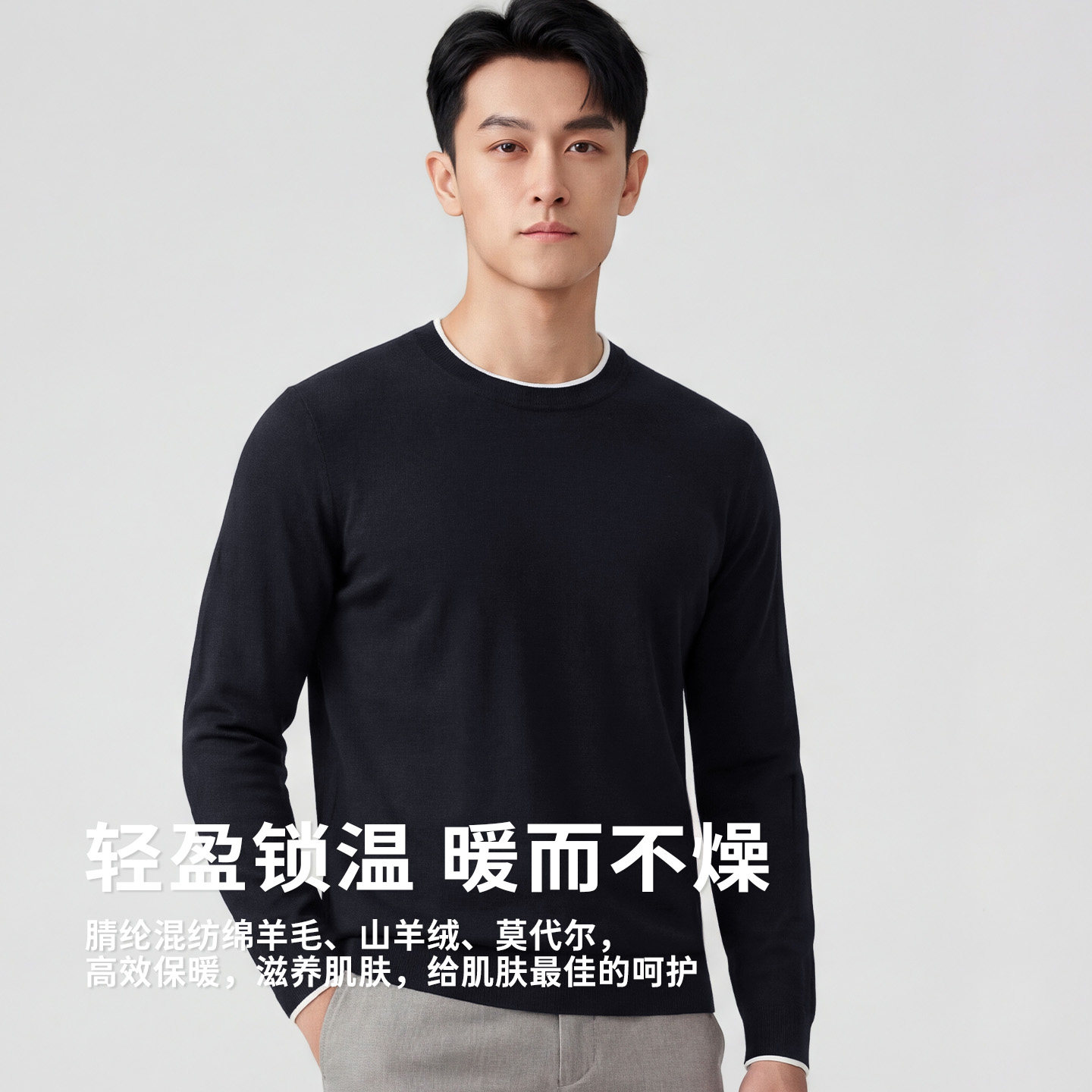 天猫[含羊绒 假两件]莱克斯顿2026春新款男装圆领针织衫休闲百搭毛衣