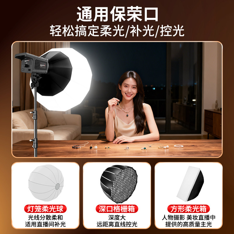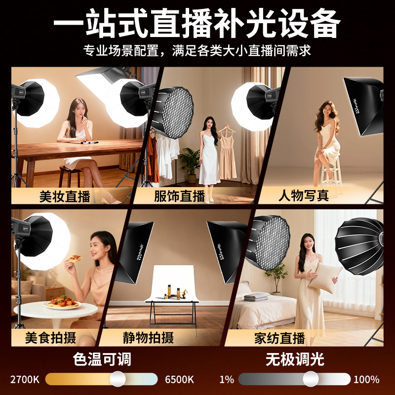 锐富图专业直播补光灯是一款专为直播间、影棚及视频拍摄打造的全套打光设备,具备100W大功率常亮光源,支持三色温调节(暖光、自然光、冷光),轻松满足不同场景与肤色调光需求。配备柔光球与柔光箱,有效减少阴影与眩光,实现柔和均匀的光效,显著提升人像美颜效果。适用于主播直播、人像摄影、短视频拍摄等多种室内场景,安装便捷,光线稳定,显色指数高,真实还原色彩细节。无论是专业摄影师还是直播达人,都能轻松打造高品质视觉呈现,是提升画面质感与专业度的理想补光之选。