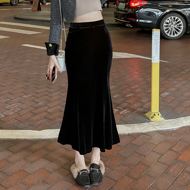 淘宝金丝绒半身裙鱼尾裙女2025秋冬款高腰a字裙修身显瘦加绒包臀裙子