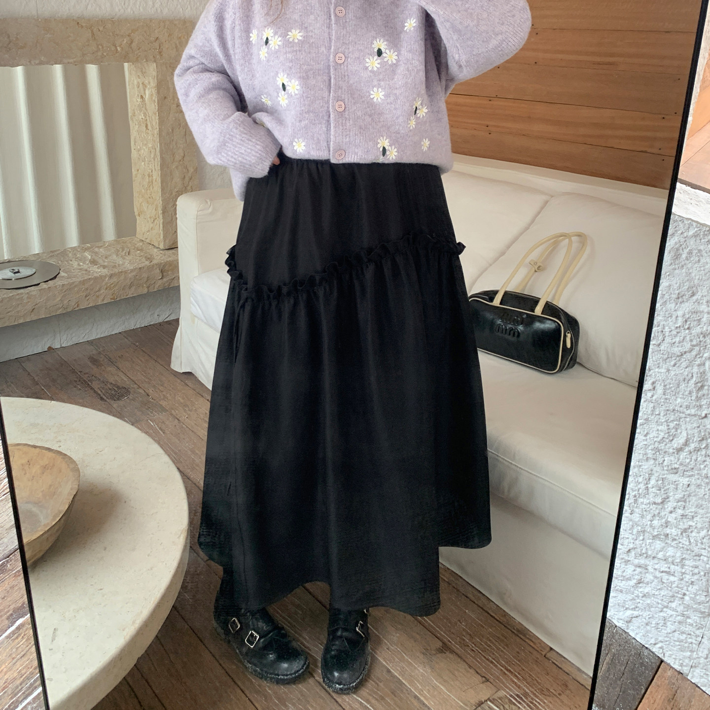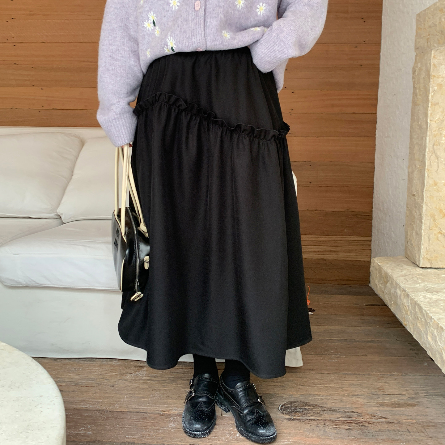 YUZI鱼子黑色A字半身长裙,专为秋冬打造,融合优雅与实用。采用高腰设计,有效拉长腿部线条,视觉显瘦,适合多种体型,包括大码女性。A字版型自然垂坠,修饰臀腿曲线,包容性强。裙身点缀精致木耳边,增添柔美细节,可系蝴蝶结设计更添俏皮与浪漫气息。精选优质面料,挺括有型,保暖舒适,适合日常通勤或约会穿搭。经典黑色百搭不挑人,轻松搭配毛衣、针织衫或大衣,展现知性优雅气质。无论是职场还是休闲场合,都能穿出自信与魅力,是秋冬衣橱的必备单品。