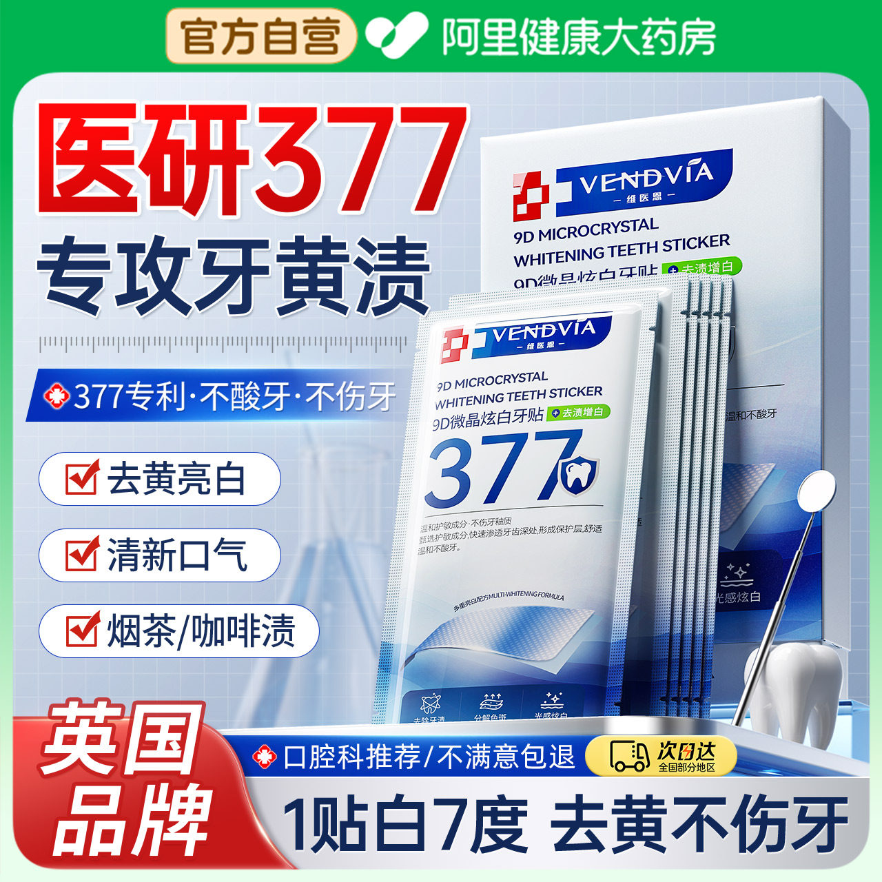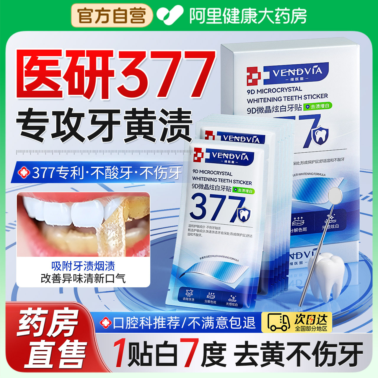 377美白牙贴是一款高效安全的牙齿美白产品,专为去除牙黄、牙垢及烟渍设计。其核心成分377(苯乙基间苯二酚)能有效抑制黑色素生成,深入渗透牙釉质,温和分解深层色素,实现由内而外的自然亮白。牙贴贴合度高,使用方便,每日仅需30分钟,持续使用7-14天即可显著提升牙齿亮白度。产品不含刺激性成分,保护牙釉质,适合长期抽烟、饮茶咖啡导致的牙渍人群。坚持使用,让您轻松拥有自信笑容,告别黄牙困扰,是居家美牙的理想选择。安全有效,让洁白笑容触手可及。