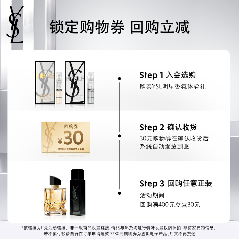 【30元购物券】限时福利!现在入手YSL自由之水女士香水与不羁男士香水,尽享法式奢华魅力。自由之水以清新柑橘融合馥郁橙花,诠释独立自信的女性力量;不羁男士则融合薰衣草与雪松,展现率性洒脱的男性气质。两款香水留香持久,层次丰富,适合日常通勤或浪漫约会。使用30元购物券,立享超值优惠,轻松将圣罗兰的经典香氛带回家。无论是自用还是送礼,都是彰显品味的绝佳选择。数量有限,先到先得,快来体验YSL带来的自由不羁与优雅格调,让香气定义你的独特风格!