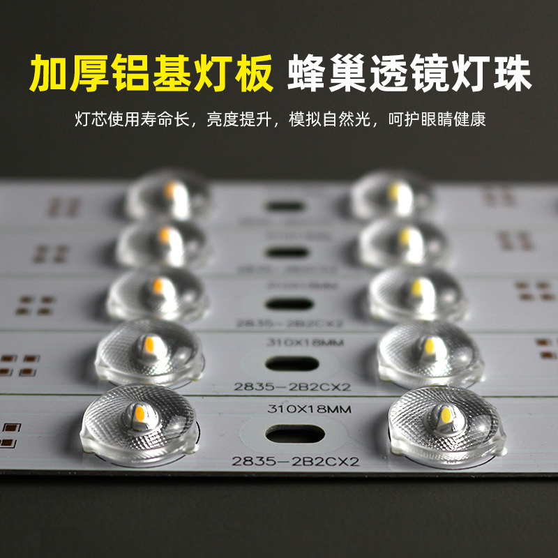 客厅吸顶灯替换灯条采用高品质LED透镜光源,具有高亮度、低能耗、长寿命等特点,节能环保,显色指数高,光线柔和均匀。支持三色变光(暖光、中性光、白光),可根据不同场景自由调节,营造舒适氛围。灯带设计为长条形改造灯板,适配多种吸顶灯结构,安装简便,无需更换整灯即可实现升级。采用优质铝材散热,运行稳定,不易频闪,保护视力。适用于客厅、卧室、书房等空间,是传统光源的理想替代品,既提升照明效果,又降低电费支出,是现代家居照明的优选方案。