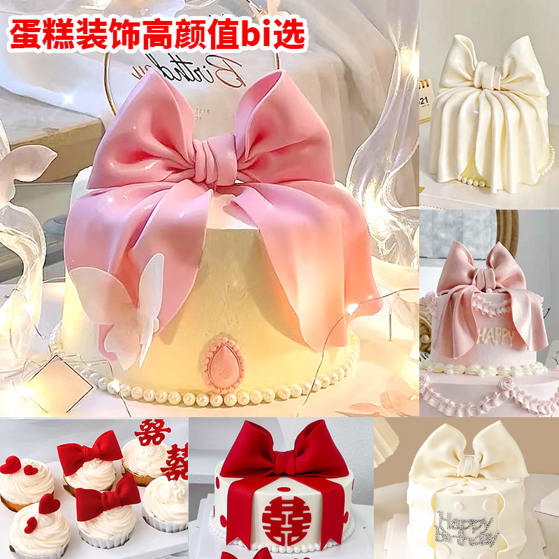 淘宝情人节订婚蛋糕装饰摆件翻糖蝴蝶结成品红色巧克力结婚甜品台配件