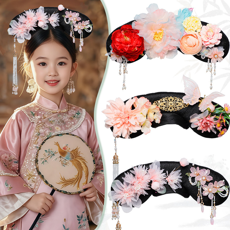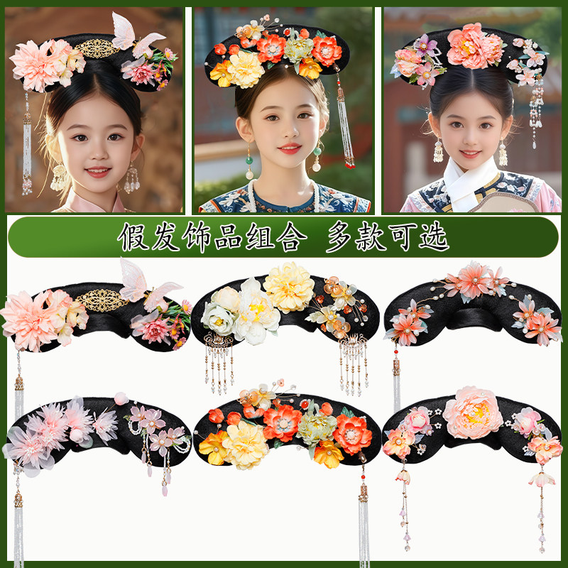 天猫儿童满清格格旗头假发包女童古装汉服头饰古风假发髻发饰组合套装