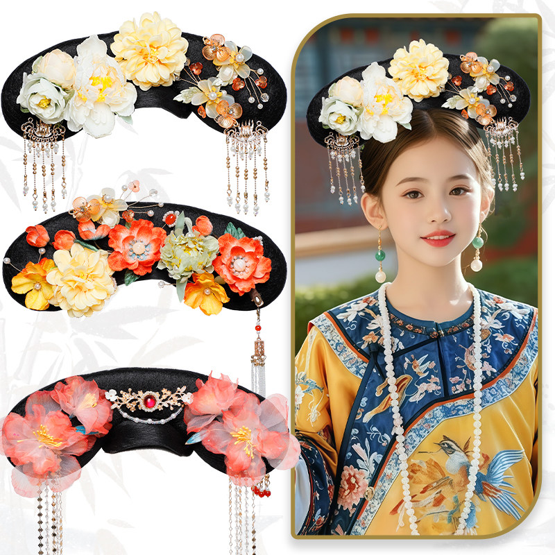 这款儿童满清格格旗头假发包,专为女童设计,融合传统满族宫廷元素与现代佩戴舒适性。套装包含精致旗头、仿真发髻及多款古风发饰,采用轻盈环保材料制作,佩戴安全无负担。发饰以珠花、流苏、绒花等装饰,还原清代格格优雅气质,搭配汉服更显古典韵味。适用于节日庆典、古装摄影、舞台表演或主题派对,让孩子轻松变身小格格,体验传统文化之美。尺寸适中,佩戴简便,是女童古装造型的理想选择,既美观又富有教育意义,传承中华服饰文化。
