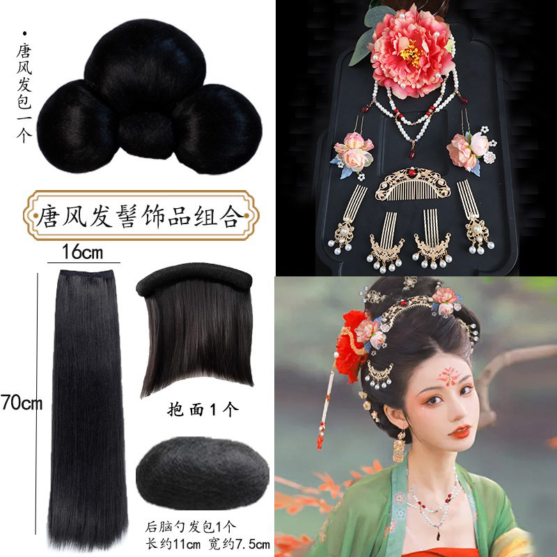 唐风发髻贵妃造型发包垫发发排发饰套装,专为古装汉服爱好者打造,完美还原盛唐宫廷贵妇的雍容华贵。套装包含高品质发包、垫发及发排,轻松塑造饱满高耸的唐代经典发髻,搭配精美仿金步摇、花钿、珠钗等头饰,细节考究,质感出众。采用轻盈透气材质,佩戴舒适不压头,适配多种汉服款式。无论是舞台演出、古风摄影还是节庆活动,都能让您瞬间化身杨贵妃般的古典美人,尽显大唐风华与东方韵味,是追求极致古风造型的必备之选。