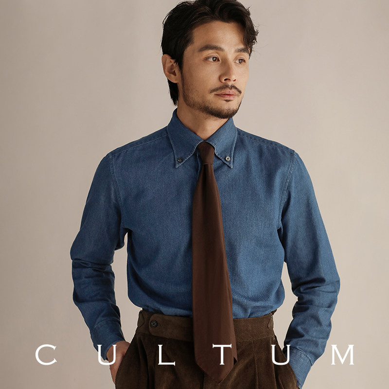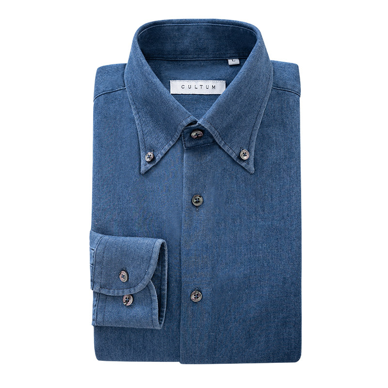 淘宝CULTUM 100%新疆长绒棉意式纽扣尖领牛仔衬衫男长袖丹宁休闲衬衣