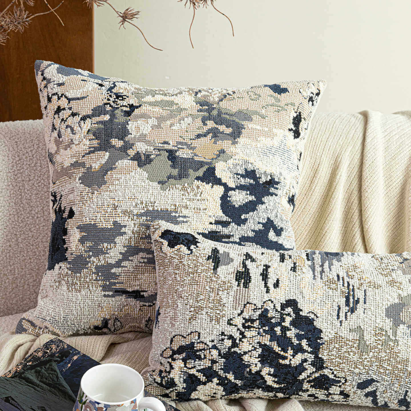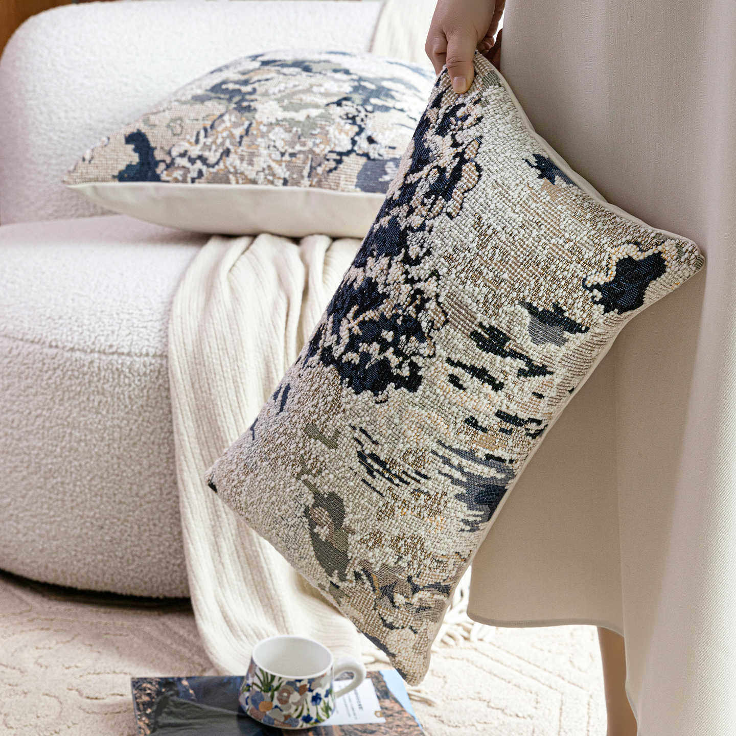 淘宝春日繁花法式中古风蓝色羊毛混纺抽象艺术感抱枕靠垫高端软装腰