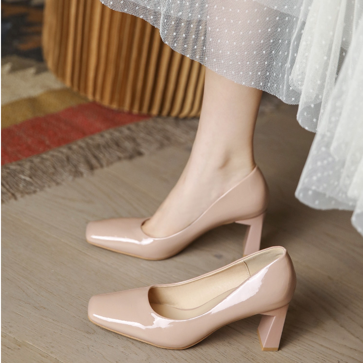 淘宝小香风粉色漆皮单鞋粗跟方头小个子秋冬新款高跟鞋女晚晚鞋配裙子