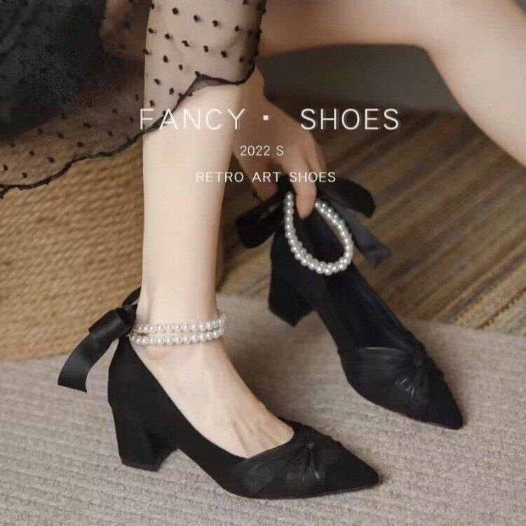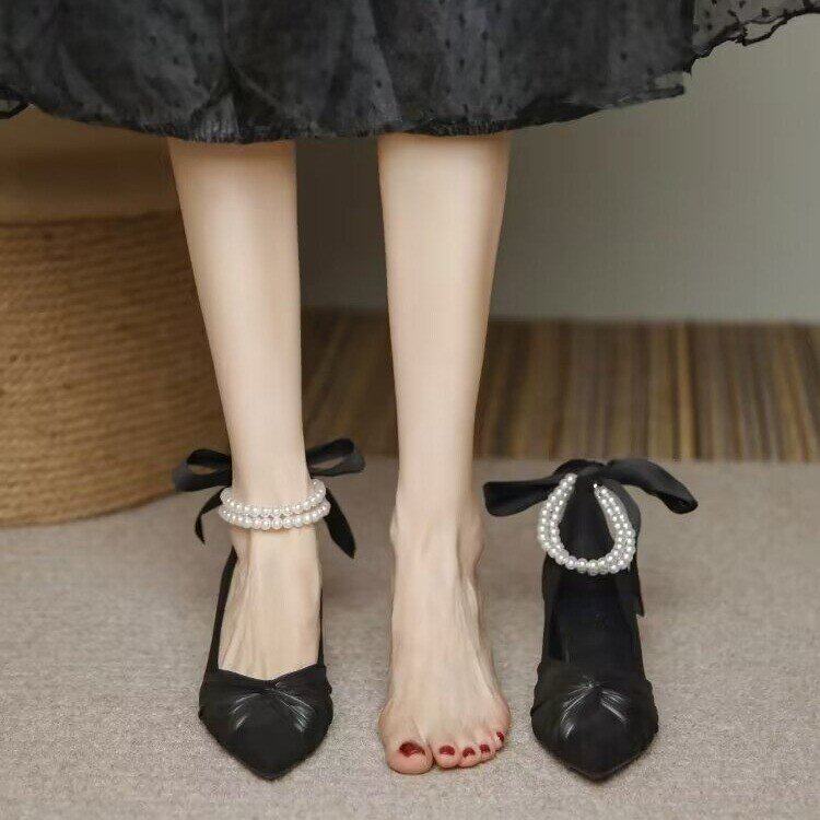 淘现货|珍珠水仙|白茶入梦原创蝴蝶结尖头细高跟优雅百搭少女鞋