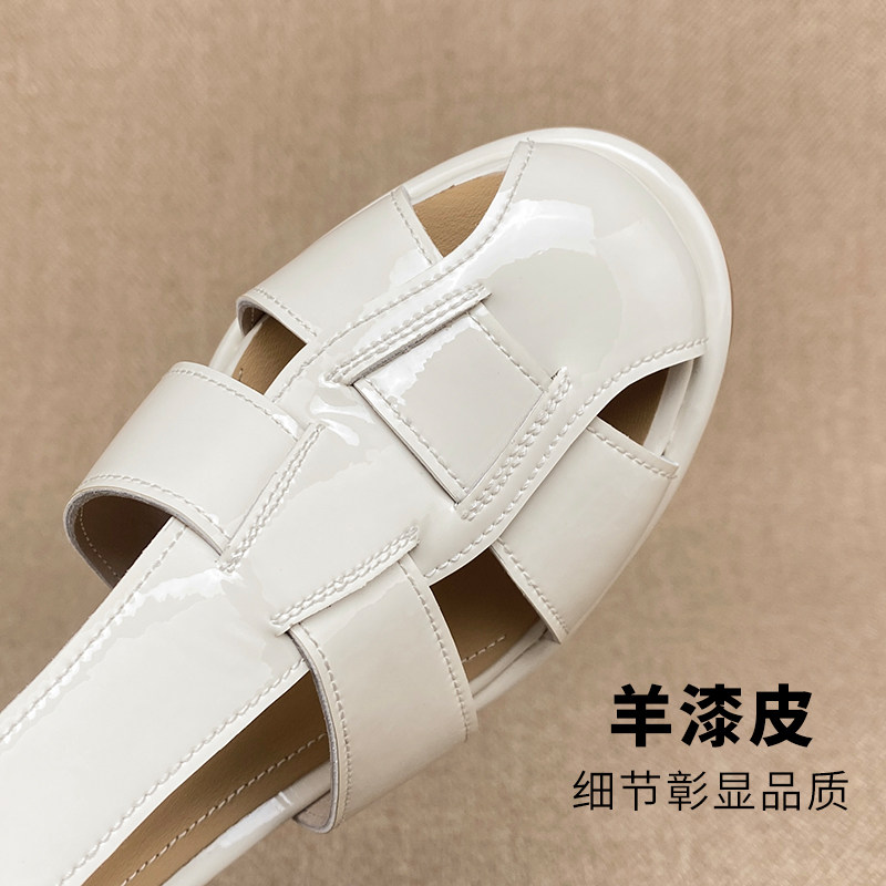 天猫夏季真皮纯色后空包头凉鞋女罗马风镂空软皮软面粗高跟鞋