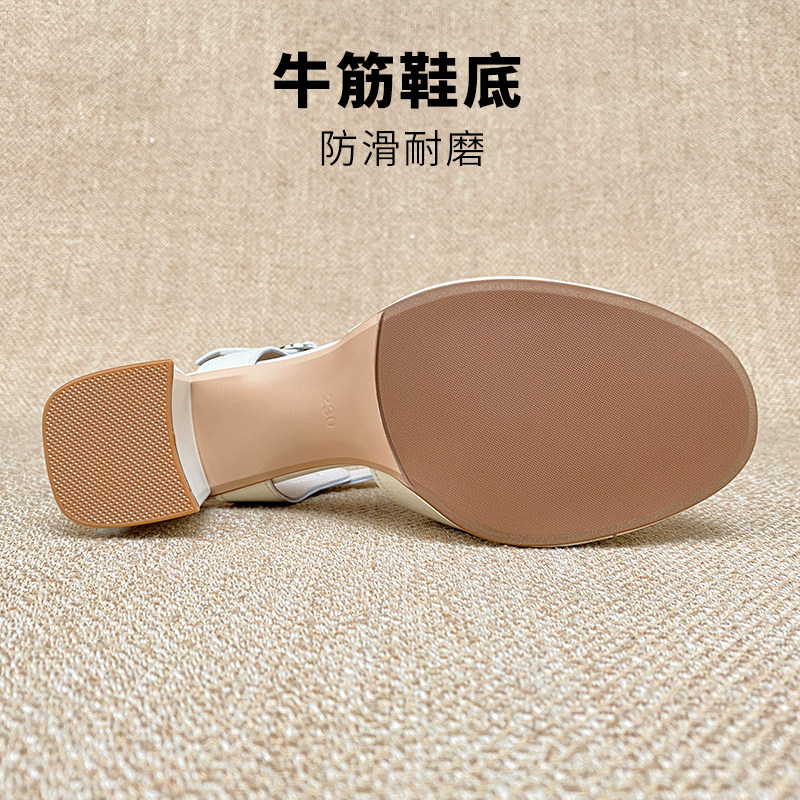 淘时尚防水台露趾高跟凉拖鞋2024夏季新米色粗跟方头一字带扣女鞋