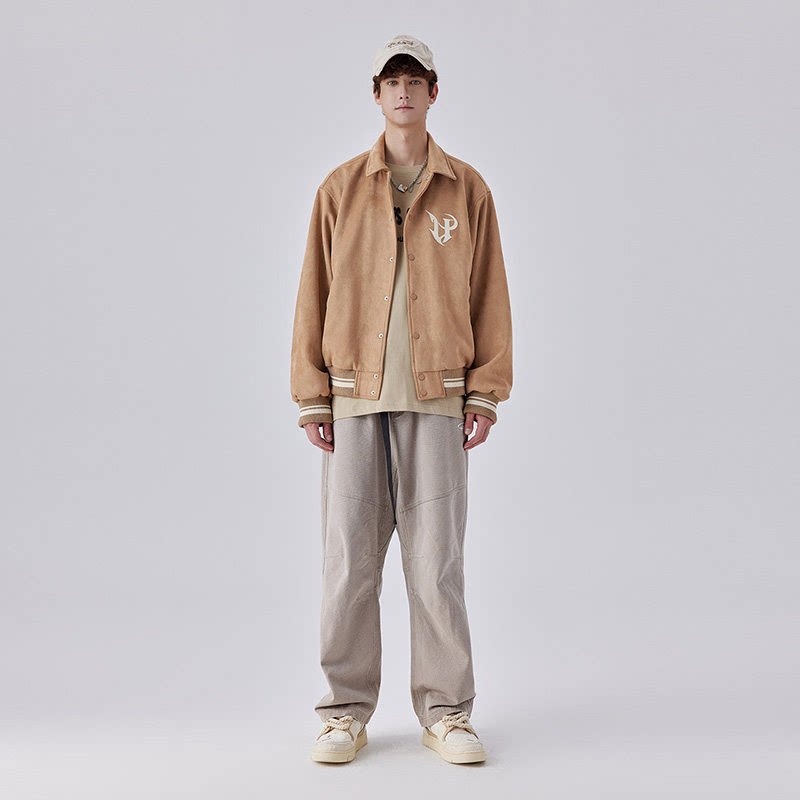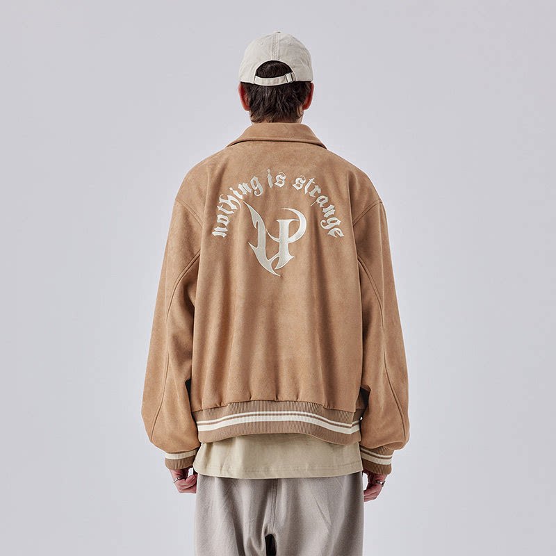 淘宝GUUKA棕色美式麂皮绒棒球服夹克男 情侣立体刺绣落肩翻领外套宽松