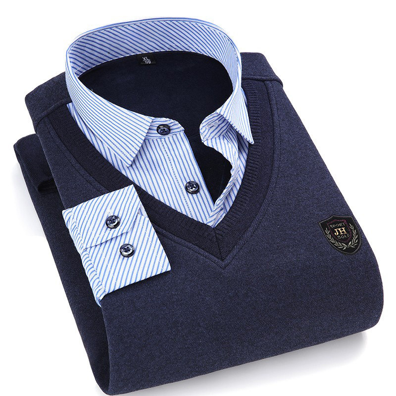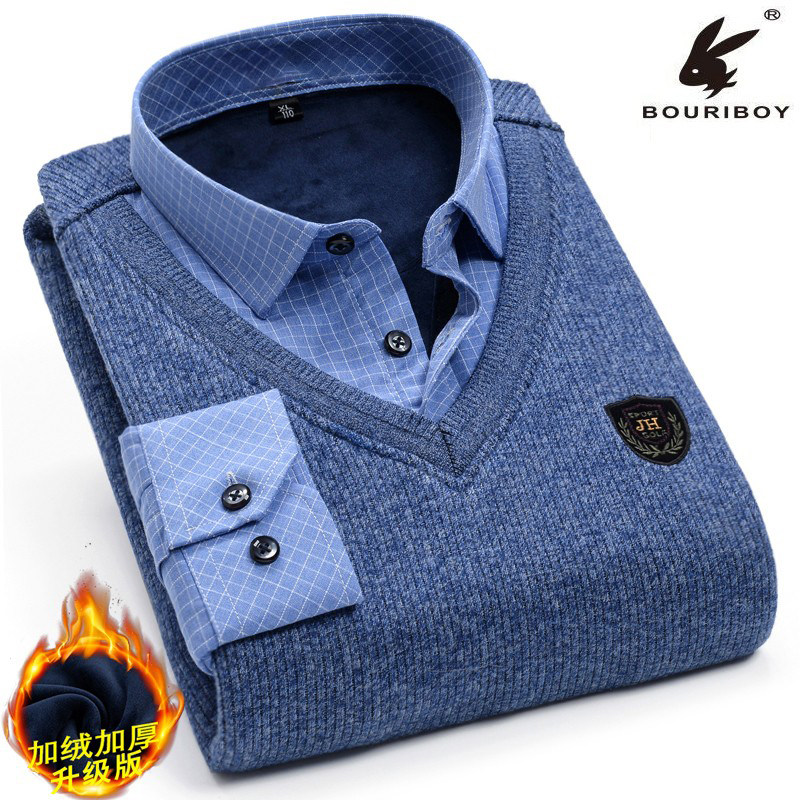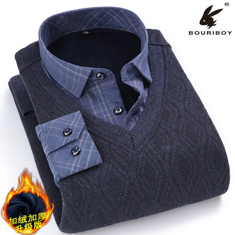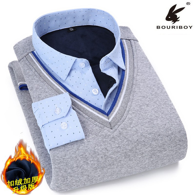 淘宝花花公子冬季保暖衬衫男加绒加厚款针织假两件衬衣纯棉中年爸爸装