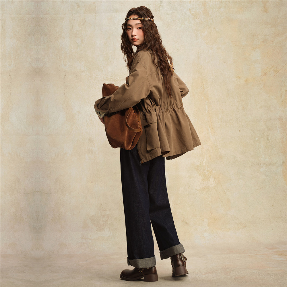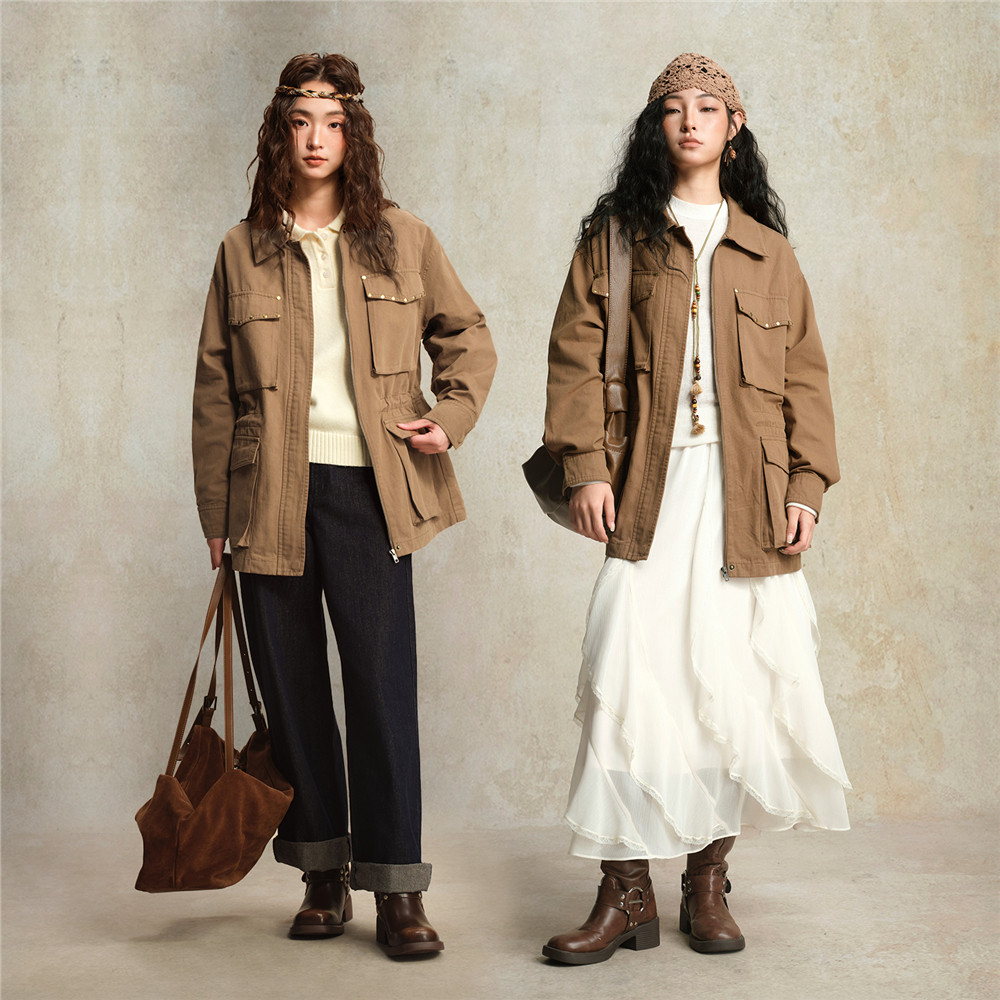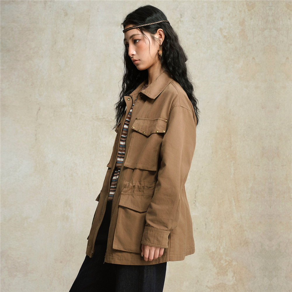 天猫设计师款佐丹奴工装夹克女装纯棉铆钉翻领中长款风衣外套18375911
