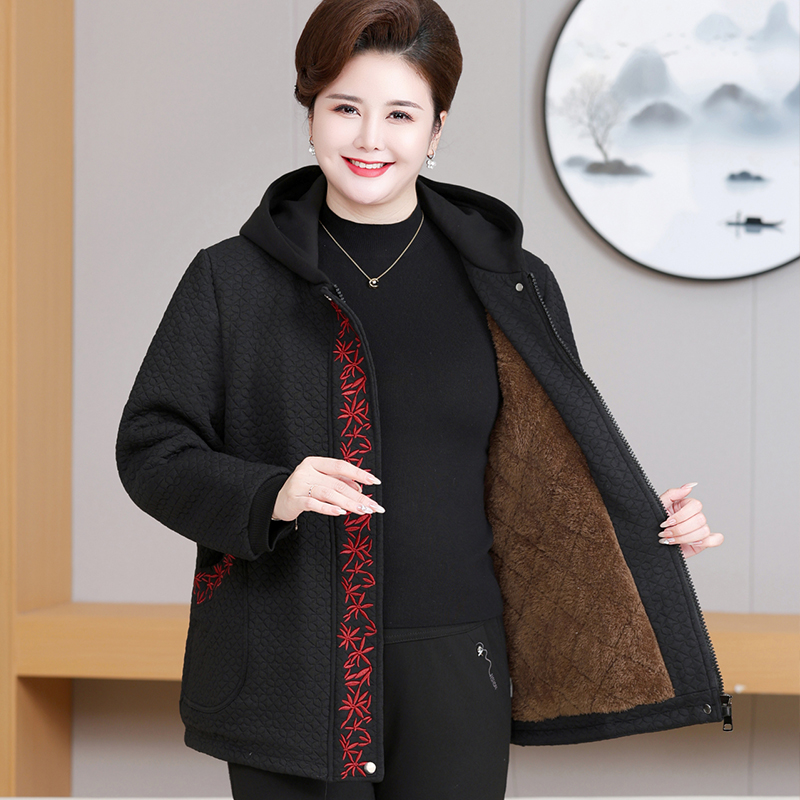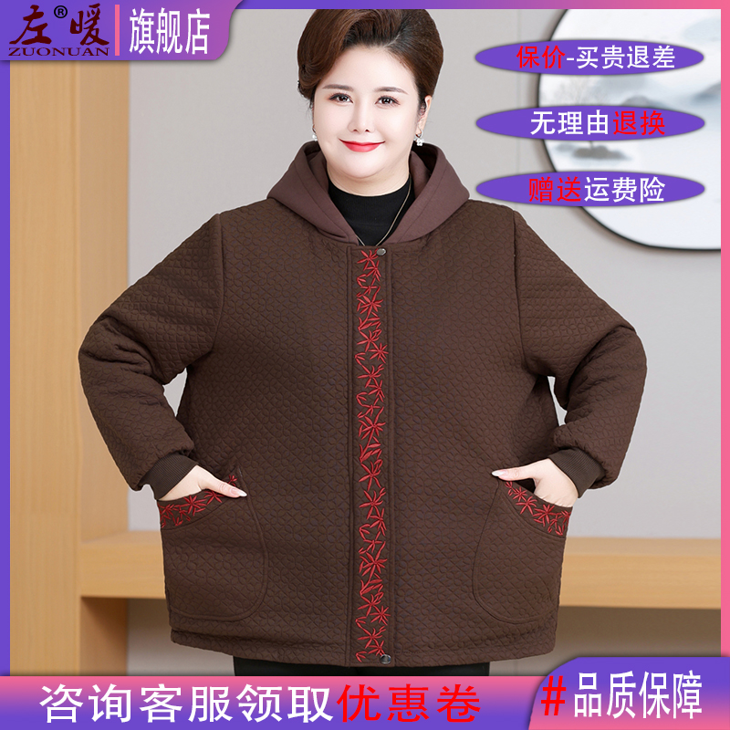 天猫胖妈妈大码加绒棉袄外套中老年连帽厚夹克女奶奶加肥宽松洋气风衣
