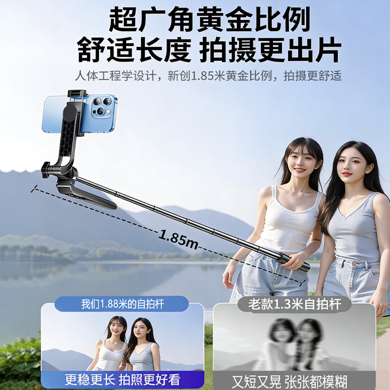 2026新款自拍杆三脚架自拍神器,集便携、稳定与多功能于一体,专为旅行摄影爱好者打造。采用高强度铝合金材质,轻便耐用,可伸缩设计轻松调节高度,满足多种拍摄角度需求。底部三脚架稳固支撑,落地使用更防抖,无论是自拍、直播还是延时摄影都能轻松应对。360°旋转手机夹兼容各类智能手机,配备蓝牙遥控,一键拍摄更便捷。折叠后仅手掌大小,随身携带无负担。无论是户外旅行、家庭聚会还是短视频创作,这款自拍神器都能助你轻松拍出专业级大片,是2026年不可或缺的拍照好帮手。