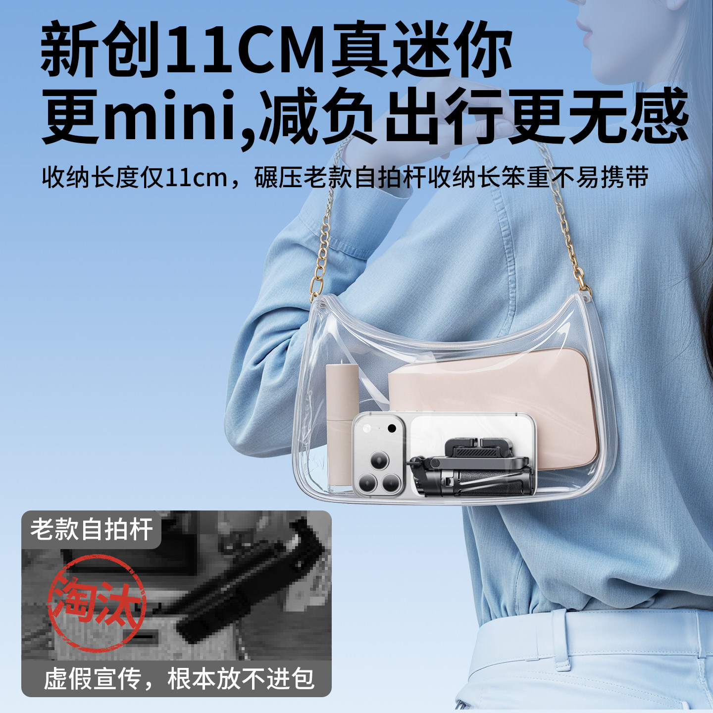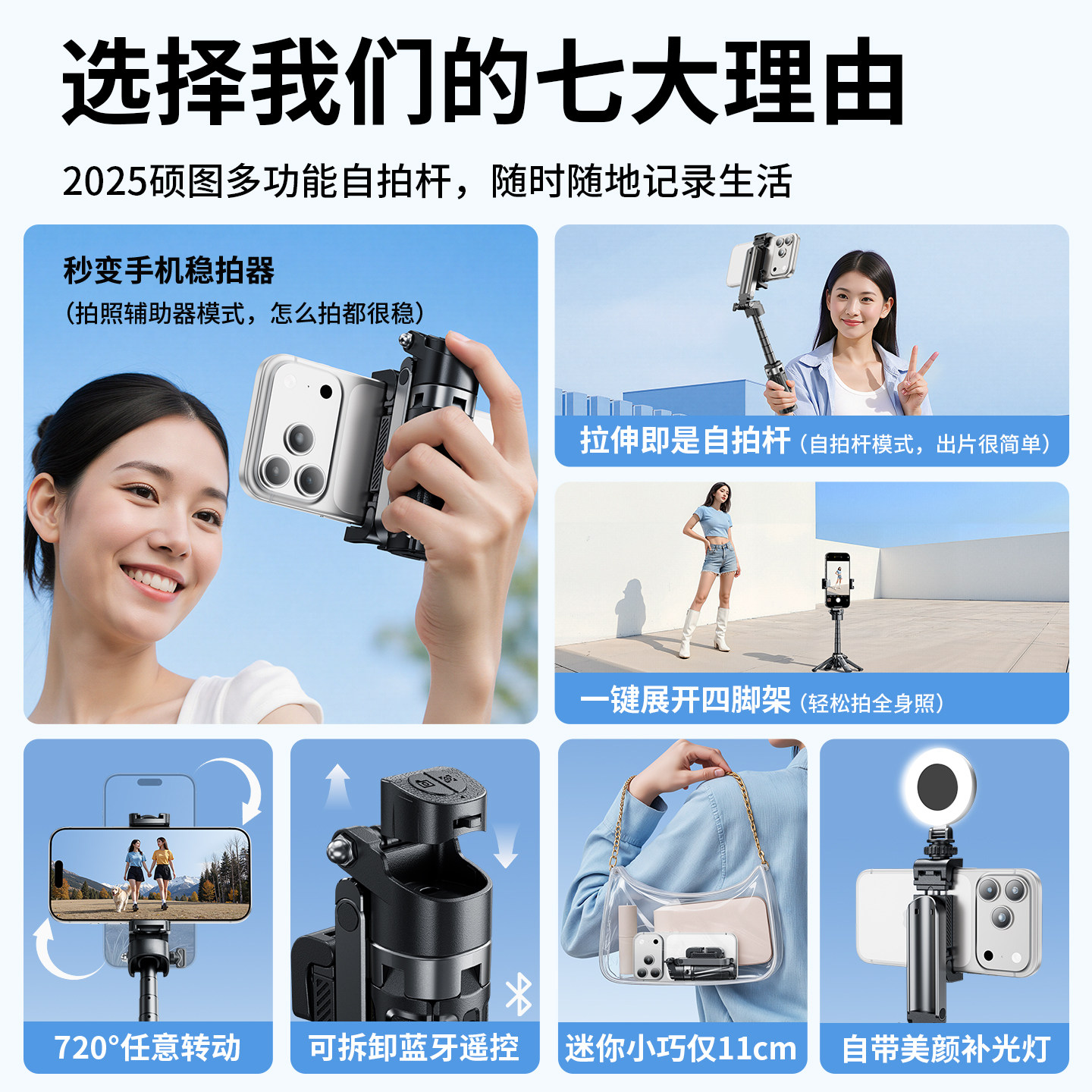 2025年全新升级【可变焦】迷你自拍杆,集便携、稳定与多功能于一体,专为旅行、Vlog、演唱会等场景打造。采用轻量化合金材质,折叠后仅手掌大小,轻松收纳。支持360°全景旋转与无极变焦调节,满足多角度拍摄需求。内置防抖技术,手持拍摄更清晰稳定。底部可展开为四脚落地支架,稳固支撑手机,解放双手。兼容各类智能手机,适配主流拍照App,一键蓝牙遥控,操作便捷。无论是自拍、直播还是延时摄影,都能轻松胜任,是旅行达人与内容创者的必备神器。