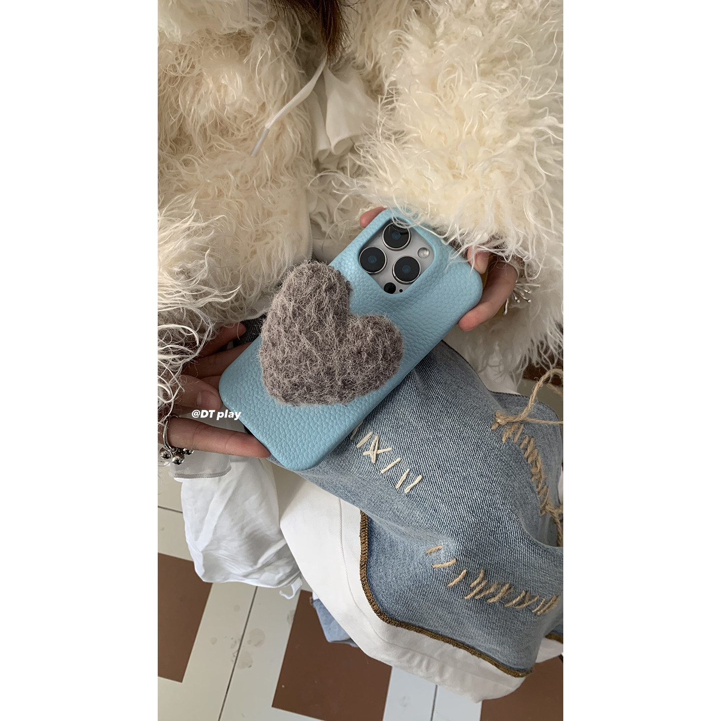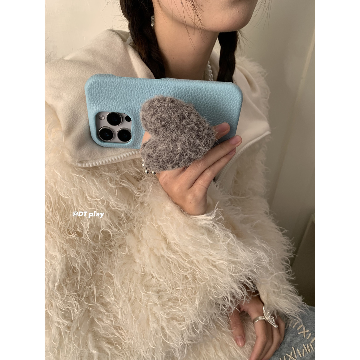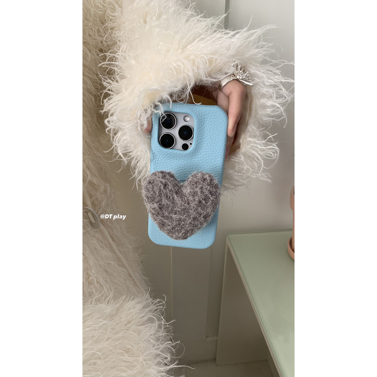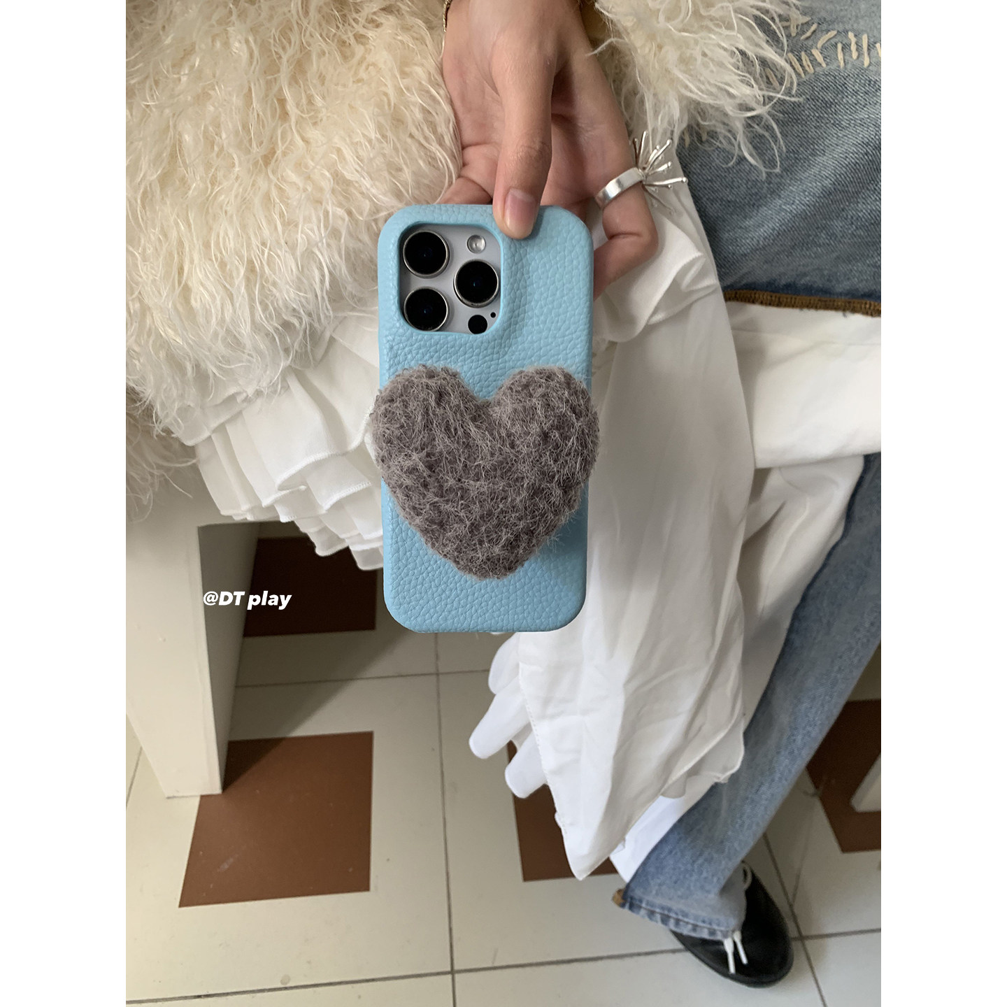 淘宝DT play 蓝色皮质毛绒爱心简约高级感韩国ins博主小众设计适用于iphone17promax/16/15苹果14/13手机壳保护套