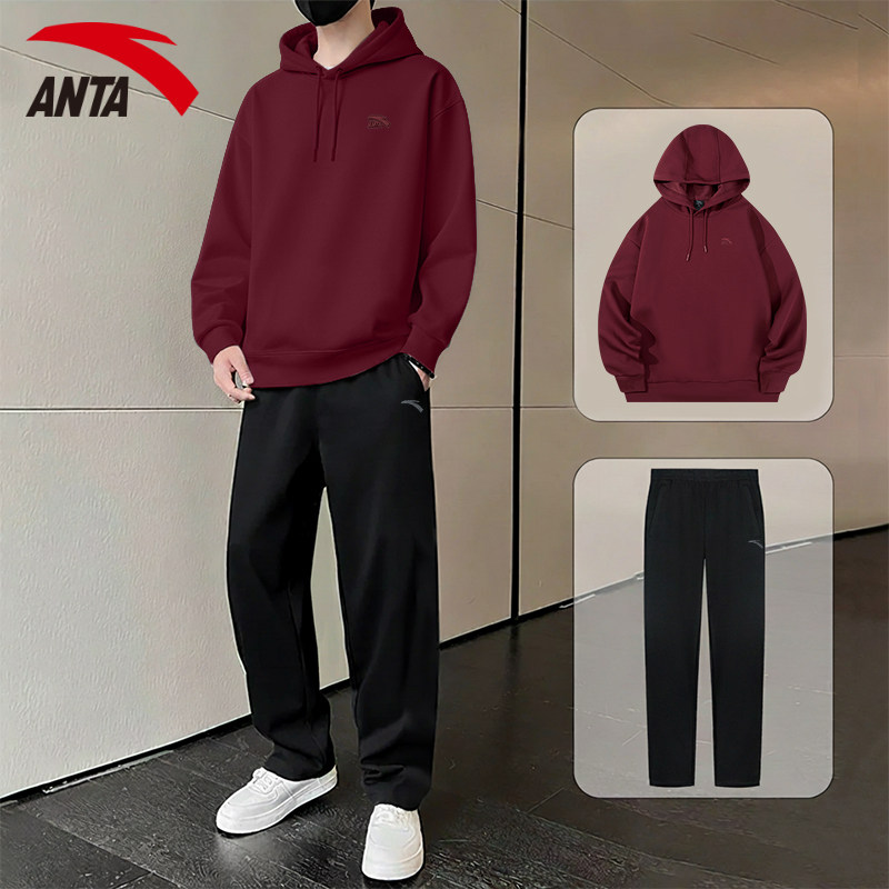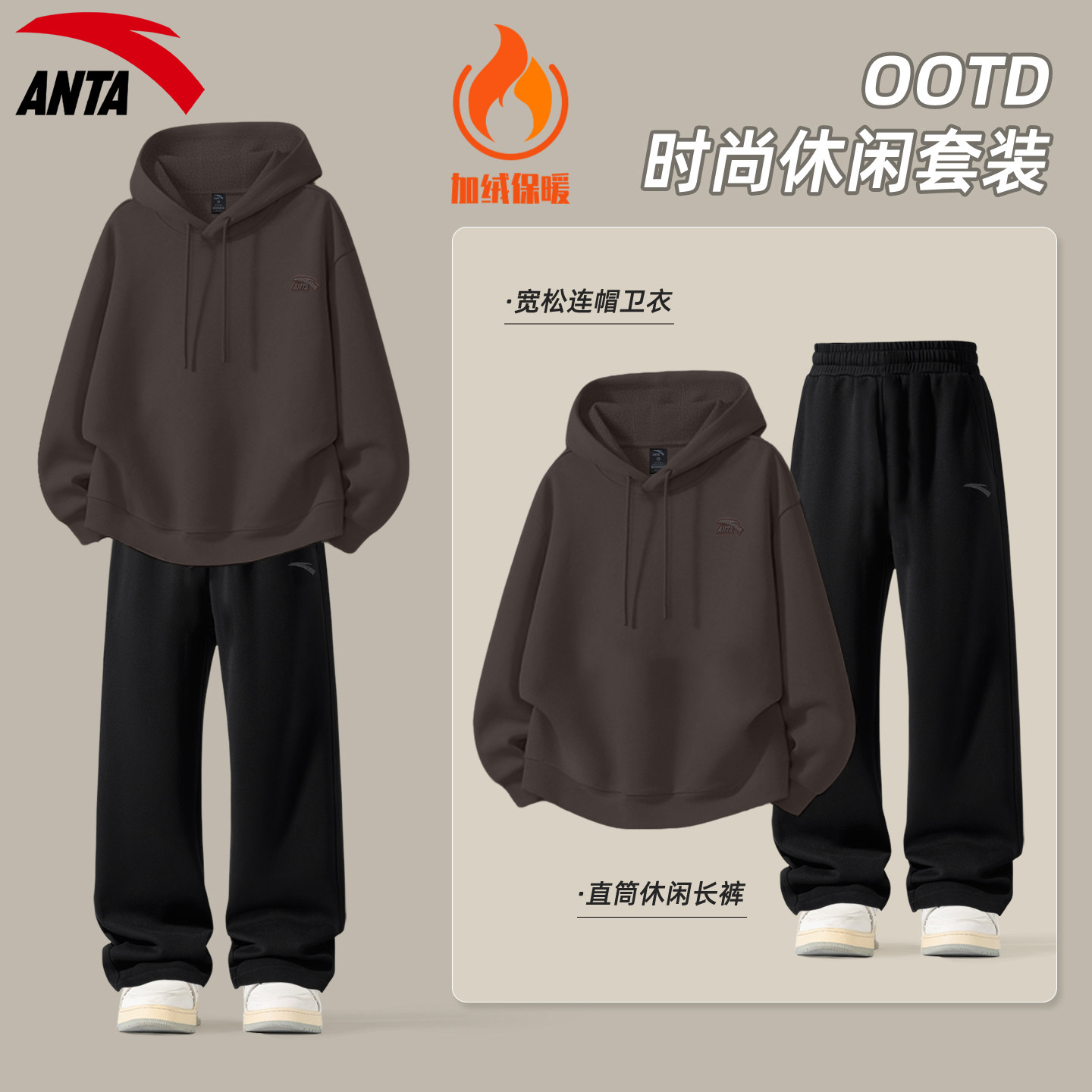 天猫安踏青少年连帽卫衣套装男加绒复古红宽松保暖冬季新款百搭两件套