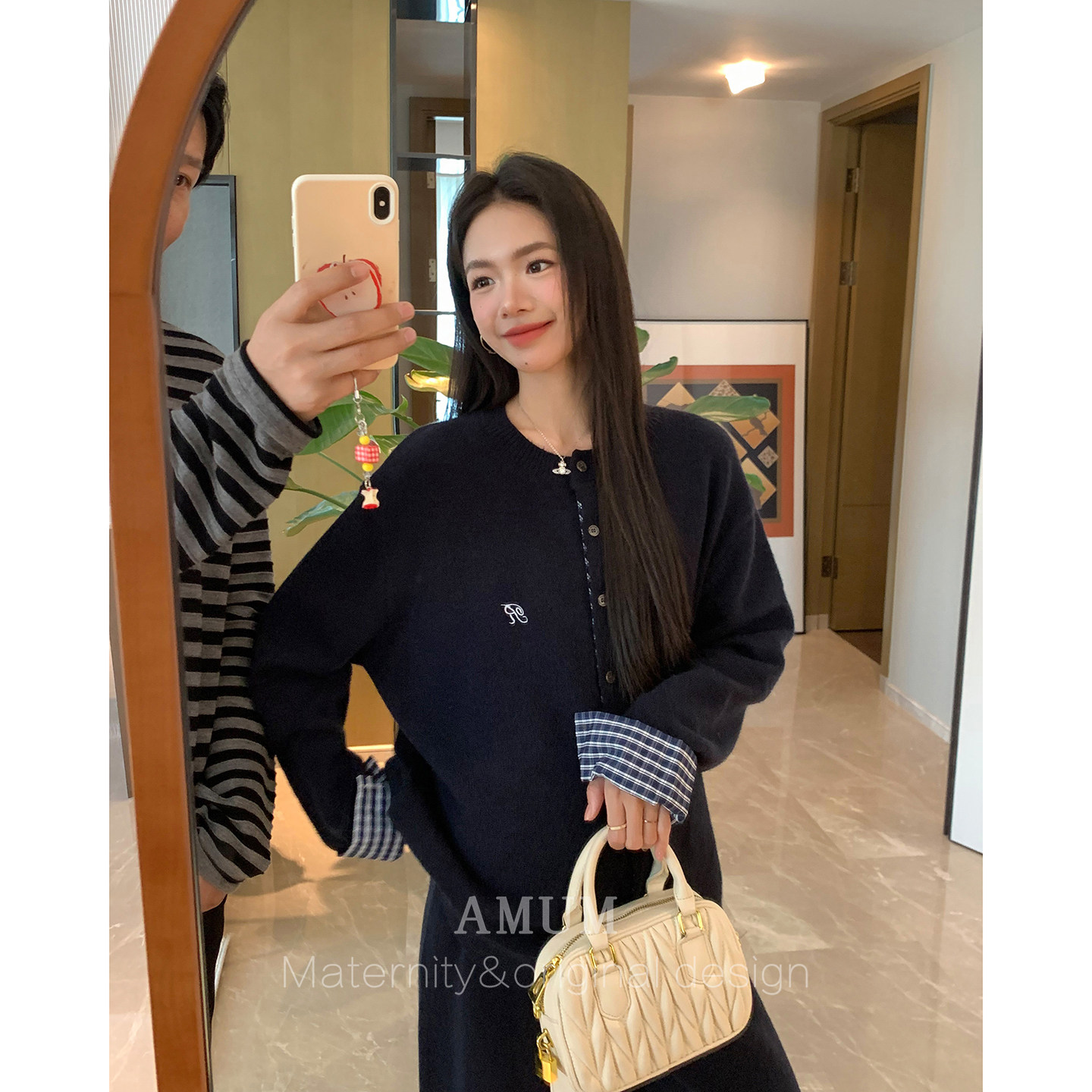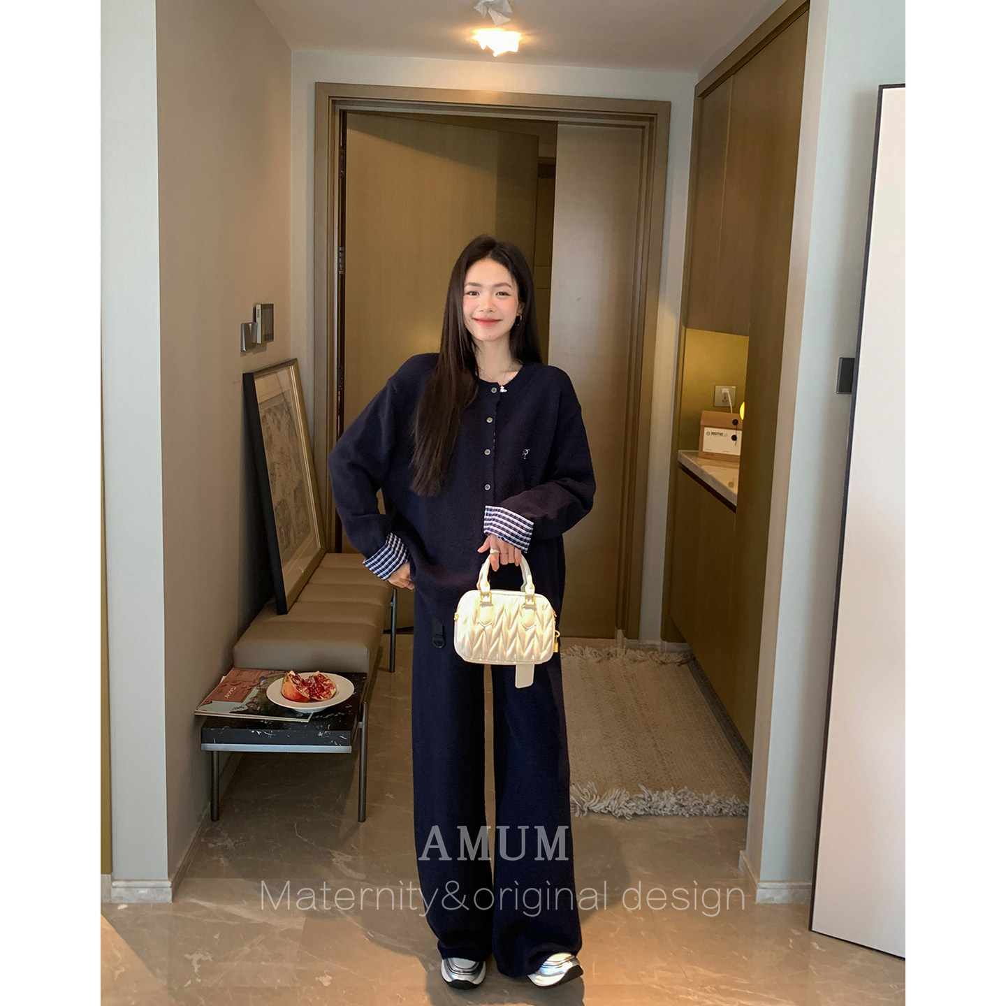 ◆AMUM孕妇装◆自在起居,轻松孕动。这款松弛感格子拼接藏青针织休闲阔腿裤套装,专为孕期女性贴心设计。采用柔软亲肤的针织面料,弹性适中,包容孕肚变化,穿着舒适无束缚。藏青色经典百搭,搭配复古格子拼接设计,简约中不失时尚感。阔腿裤型修饰腿型,行走自在,居家、外出皆宜。上衣宽松剪裁,方便哺乳,细节处体现匠心。无论是孕期还是产后,都能轻松驾驭,展现从容优雅的准妈妈风范。AMUM,让每一位妈妈在特殊时光里,依然美丽自信,享受每一刻的松弛与自在。