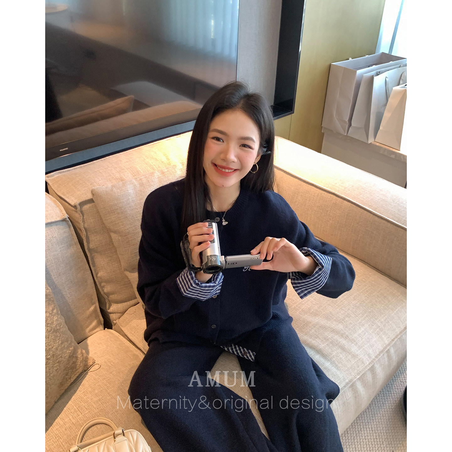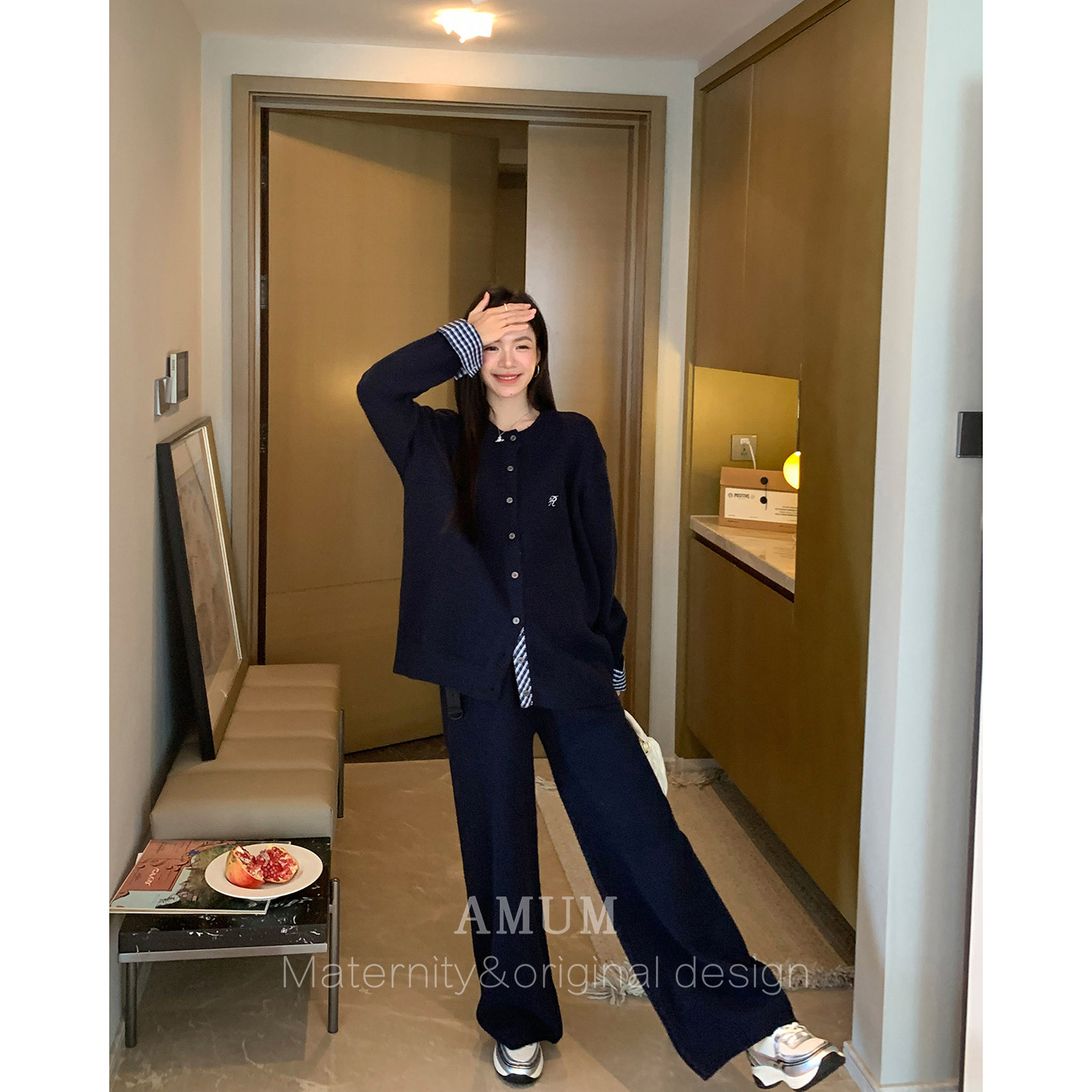 淘宝◆AMUM孕妇装◆自在起居~松弛感格子拼接藏青针织休闲阔腿裤套装